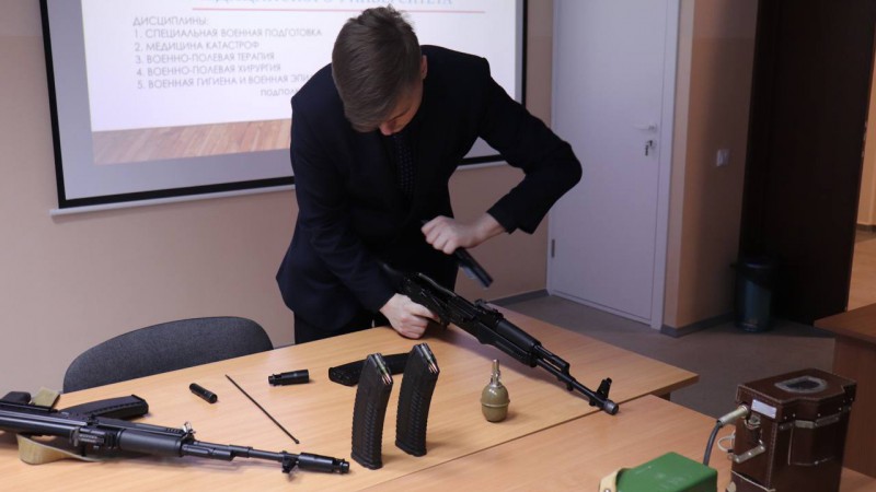 Преподаватели военной кафедры провели для гостей небольшое практическое занятие по сбору-разбору автомата Калашникова, продемонстрировали полную экипировку современного военнослужащего, отдельно остановились на современном медицинском оснащении для оказания первой помощи в условиях боевых действий, показали элементы тренажеров для занятий со студентами. Абитуриенты смогли практически поучаствовать в отработке медицинских манипуляций на манекенах.