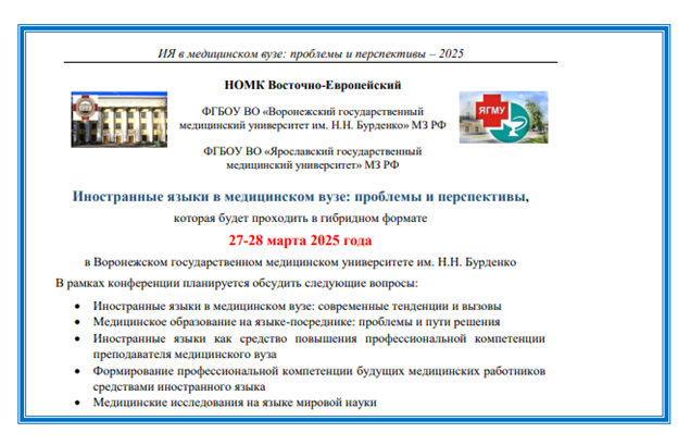 27-28 марта 2025 года заведующий кафедрой иностранных языков Разводовская Я.В. приняла участие в IV Межвузовской (кластерной) учебно-методической конференции «Иностранные языки в медицинском вузе: проблемы и перспективы», организованной на базе кафедры иностранных языков Воронежского государственного медицинского университета им. Н.Н. Бурденко совместно с Ярославским государственным медицинским университетом. В 2025 году кафедре иностранных языков ВГМУ им. Н.Н. Бурденко исполняется 95 лет.