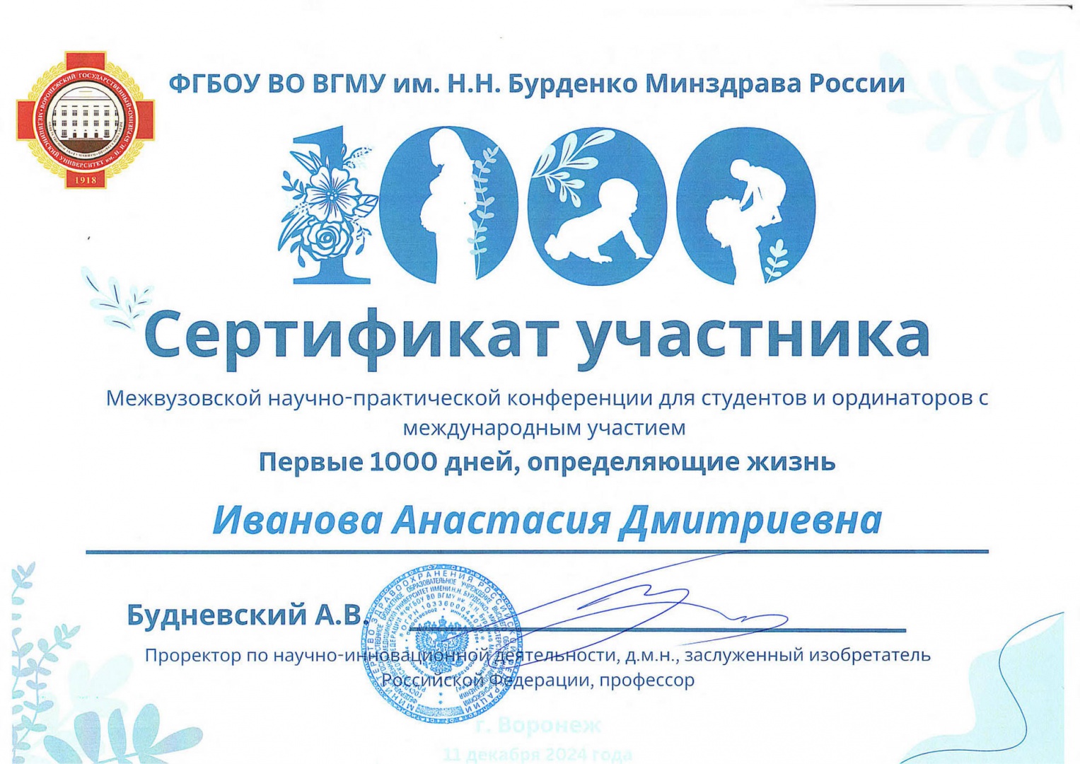 11 декабря 2024 года в ФГБОУ ВО ВГМУ им. Н.Н. Бурденко Минздрава России состоялась II межвузовская научно-практическая конференция для студентов и ординаторов с международным участием «Первые 1000 дней, определяющие жизнь».