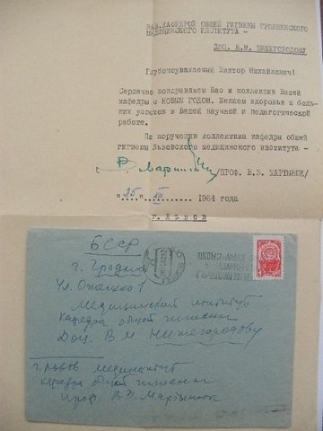 Поздравительное письмо В.Н. Нижегородову от заведующего кафедрой общей гигиены Львовского государственного медицинского института, доктора медицинских наук, профессора В.З. Мартынюка