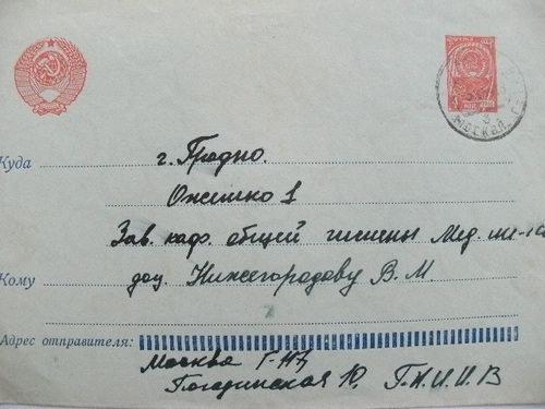 Конверт письма В.М. Нижегородову из НИИ гигиены с благодарностью о предоставленных методических разработках