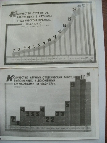 В 1970-е гг. научное студенческое общество при кафедре общей гигиены неоднократно становилось победителем в общеинститутских конкурсах, а его участники – обладателями Почетных дипломов, грамот и различного рода призов как на республиканских, так и на всесоюзных научно-практических конференциях.