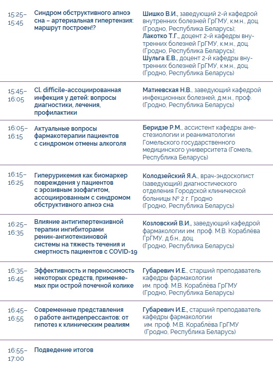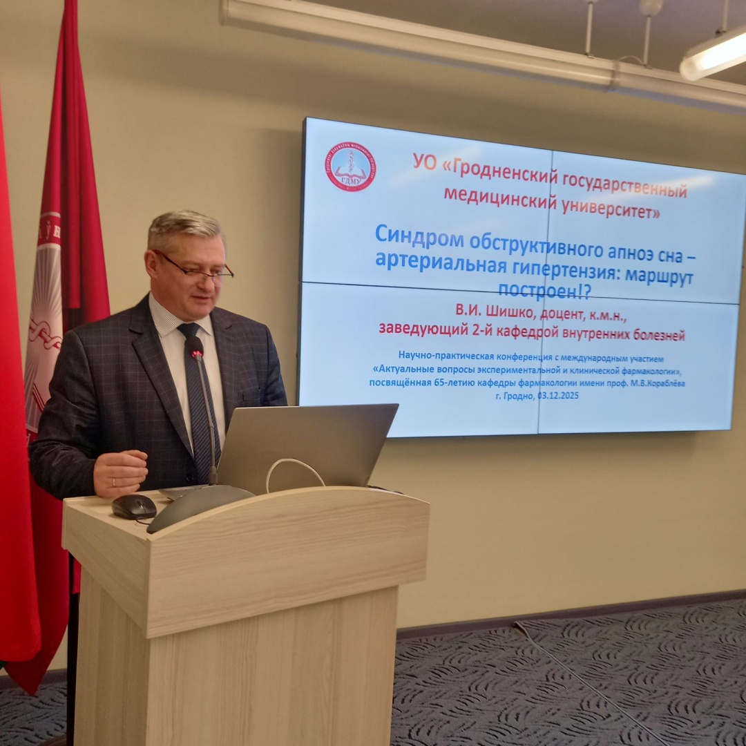 На научно-практической конференции с международным участием «Актуальные вопросы экспериментальной и клинической фармакологии», приуроченной к 65-летнему юбилею кафедры фармакологии имени профессора М. В. Кораблева, выступили с докладом «Синдром обструктивного апноэ сна – артериальная гипертензия: маршрут построен!?» Шишко Виталий Иосифович, заведующий 2-й кафедрой внутренних болезней, доцент и соискатель кафедры Колодзейский Ярослав Александрович, заведующий диагностическим отделением учреждения здравоохранения «Городская клиническая больница №2 г.Гродно» с докладом «Гиперурикемия как биомаркер повреждения у пациентов с эрозивным эзофагитом, ассоциированным с синдромом обструкивного апноэ сна».