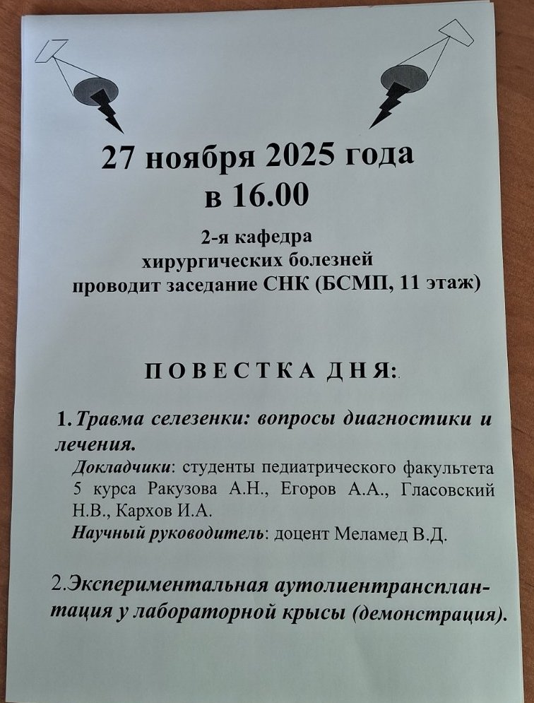 07.12.2023 состоялось заседание СНК 2-й кафедры хирургических болезней. Присутствовало 11 студентов. Староста СНК Ворончихин Г.Ю. и его заместитель Мисюк В.А. представили доклад на тему: «Травма селезенки: диагностика и лечение» (руководитель доцент Меламед В.Д.). Достойно была подготовлена презентация и изложение материала было на высоком уровне. Были получены исчерпывающие ответы на многочисленные вопросы.