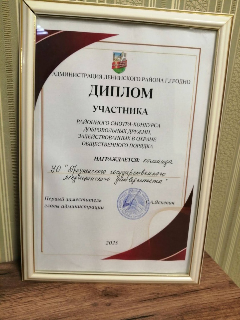 Стоит отдельно отметить участие сотрудников кафедры в смотре-конкурсе добровольных дружин, задействованных в охране общественного порядка. Команда проявила себя с лучшей стороны и была отмечена Дипломом администрации Ленинского района г. Гродно. Поздравляем!