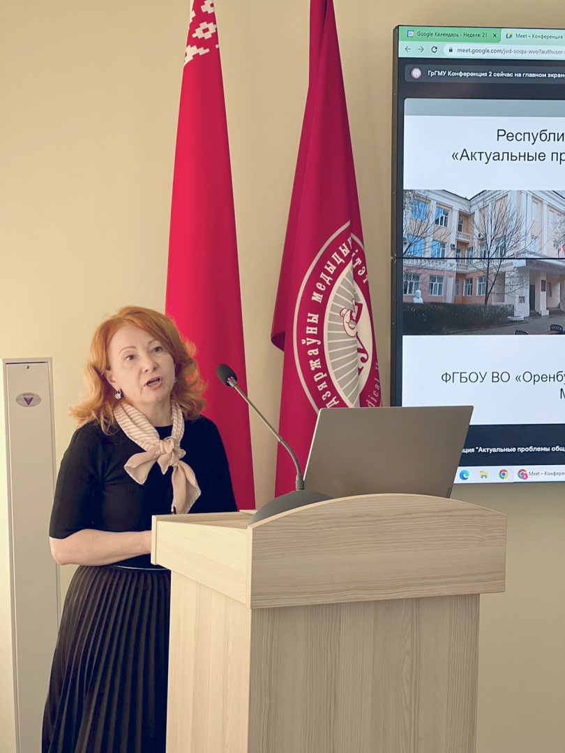 Пленарное заседание проводилось как offline, так и в режиме видеоконференции с использованием Google Meet. Докладчики находились в аудитории 9 главного корпуса ГрГМУ (Лелевич В.В., Карнаухова И.В. (г. Оренбург, Россия), Лелевич С.В., Билецкая Е.С., Дорошенко Е.М., Надольник Л.И.).