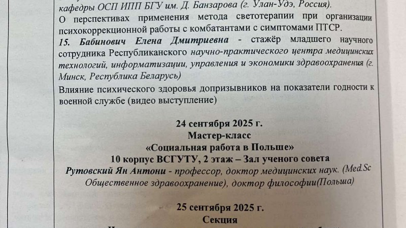 24 сентября 2025 года М.Ю. Сурмач и Н.Е. Хильмончик приняли участие в мастер-классе профессора «Социальная работа в Польше» Рутовского Яна Антони.