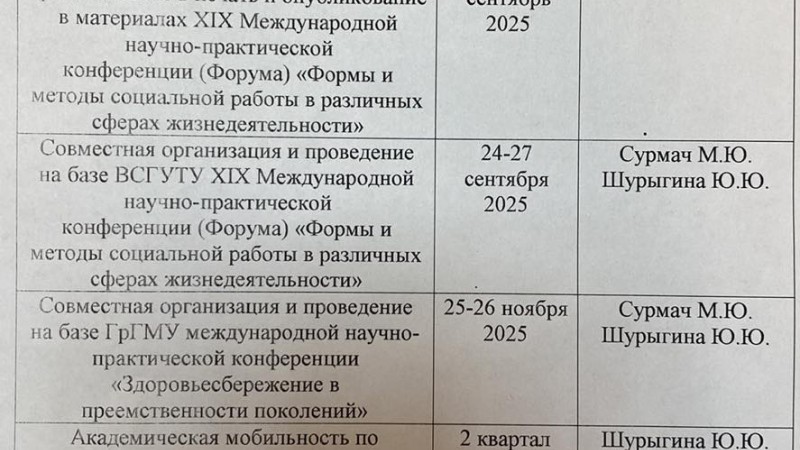 По окончании конференции 27 сентября 2025 года гродненской делегацией совместно с преподавателями дружественной кафедры ВСГУТУ обсуждены мероприятия дальнейшего сотрудничества, заведующими кафедр подписан календарный план выполнения соглашения о сотрудничестве на 2025-2026 учебный год, а затем изучены и обсуждены материалы, поступившие для участия в последующей совместной международной конференции - «Здоровьесбережение в преемственности поколений», организация которой запланирована на 25-26 ноября 2025 года на базе ГрГМУ в Гродно.