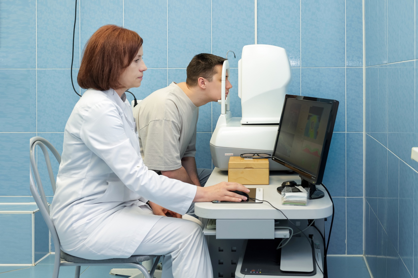 Старший преподаватель кафедры Солодовникова Н.Г. проводит оптическую когерентную томографию пациенту