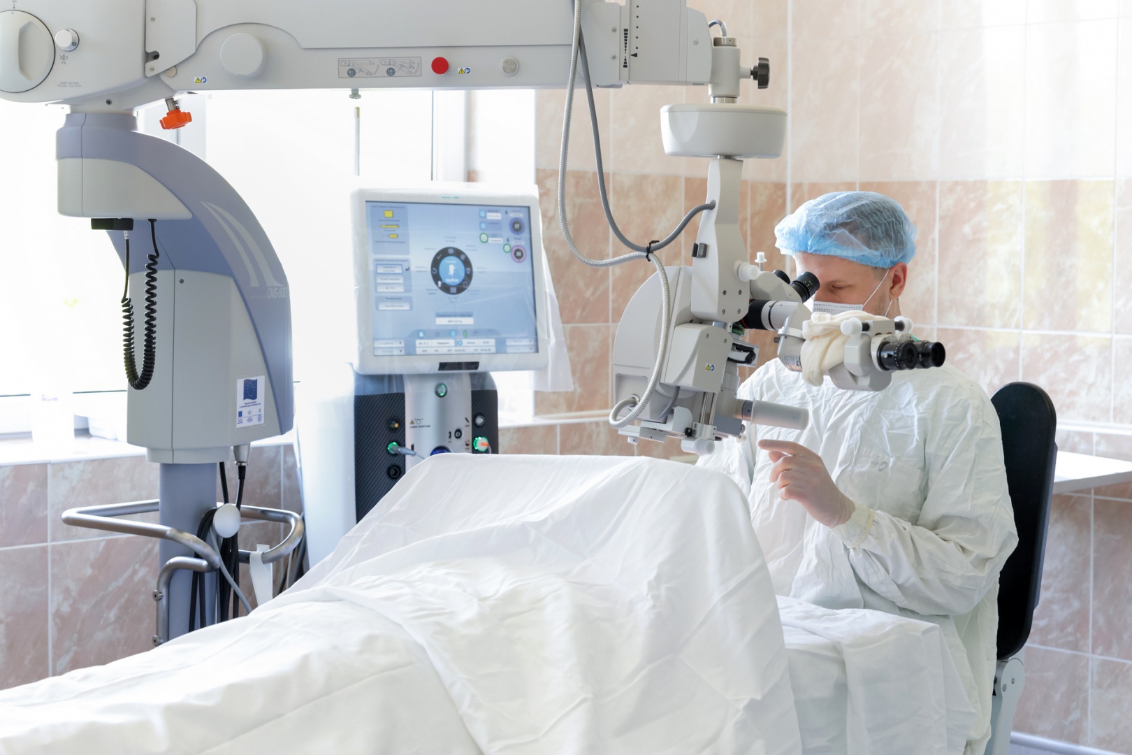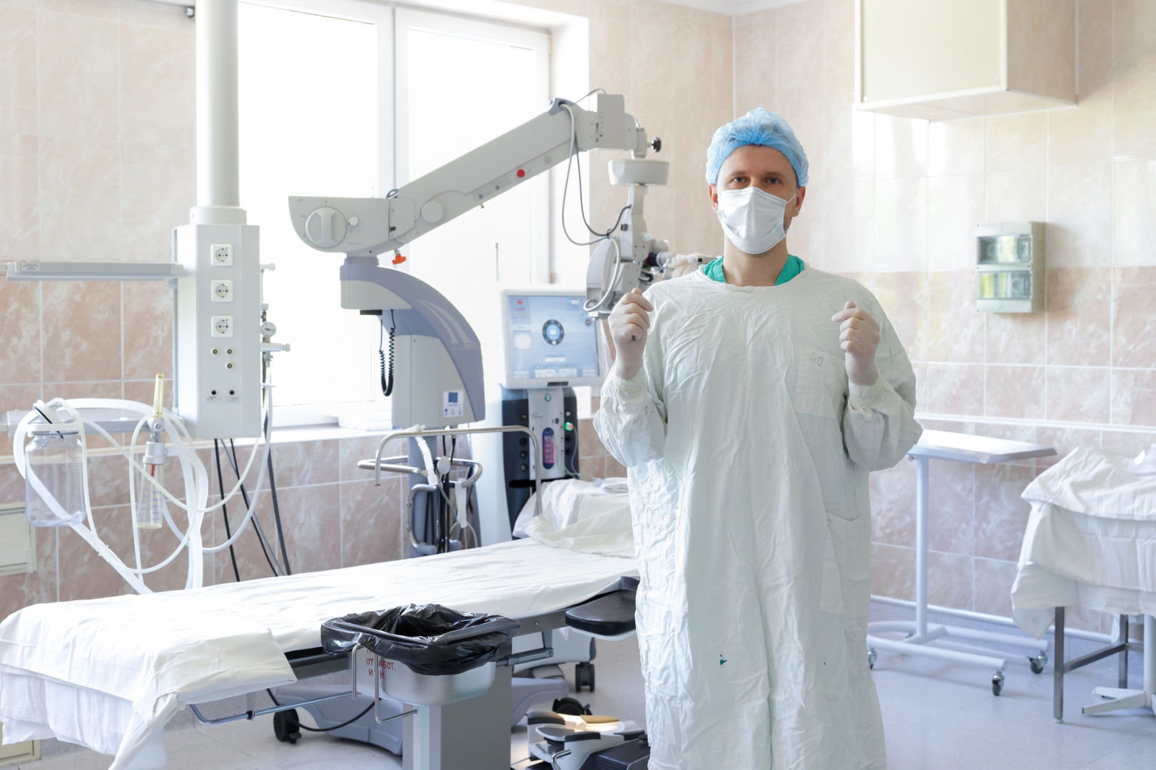 Доцент Мармыш В.Г. проводит факоэмульсификацию катаракты с имплантацией интраокулярной линзы в операционной отделения микрохирургии глаза УЗ "Гродненская университетская клиника"