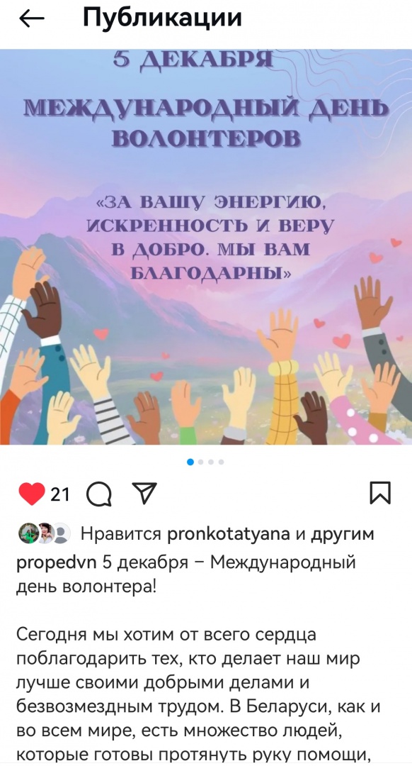5 декабря – Международный день волонтёров. Официальное название этой даты, инициированной ООН в 1985г., - Международный день добровольцев во имя экономического развития. В Беларуси активно продвигается деятельность волонтёрских движений: Красного Креста, Юнисеф, проекты добровольцев БРСМ и др.