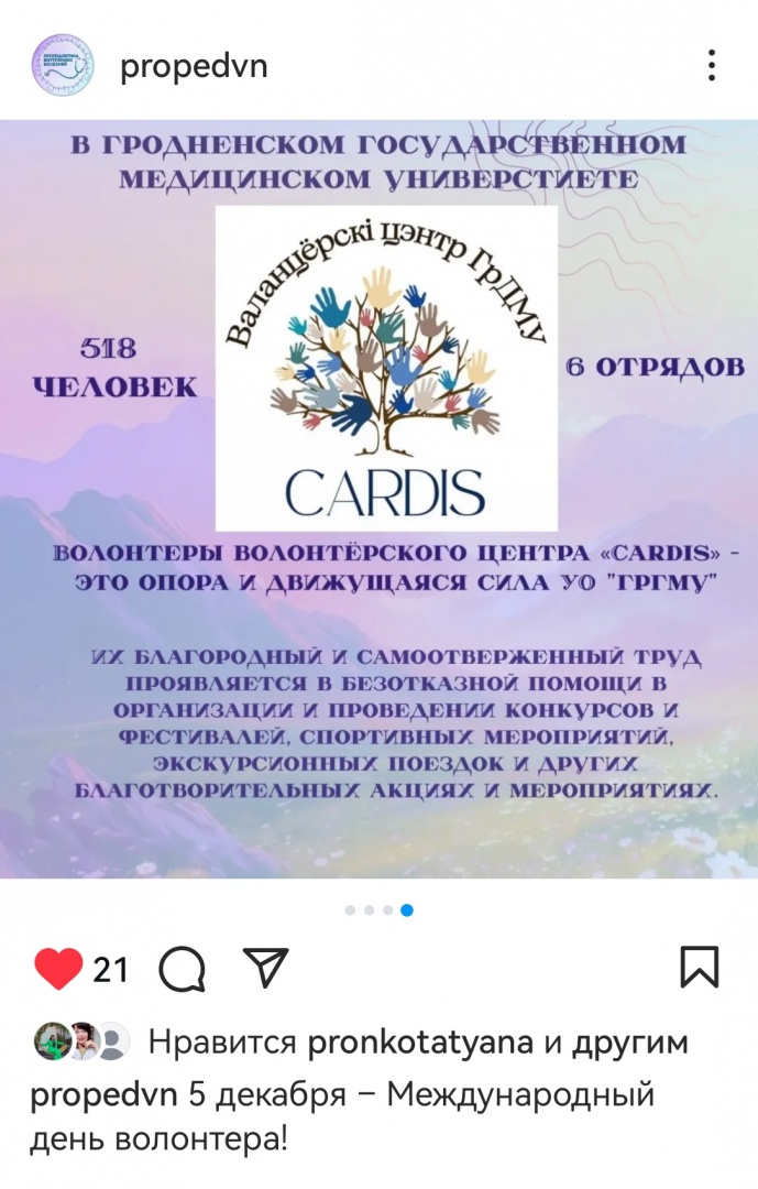 05.12.25 г. в 14 группе 2 курса ЛФ проведена дискуссия на тему «Какие качества необходимы добровольцу-волонтёру», приуроченная к Международному дню волонтёров. Ст. преподавателем Тауб Г.С. было сделано сообщение о существующих видах волонтёрской деятельности, рассказана история возникновения праздника, приведены статистические данные по Беларуси, уделено внимание работе волонтёрской организации «Кардис», работающей в ГрГМУ. Дискуссия прошла активно, студенты указывали на основные качества, которые должны быть присущи волонтёрам, а многие оказались волонтёрами и поделились своими впечатлениями о волонтёрской работе.