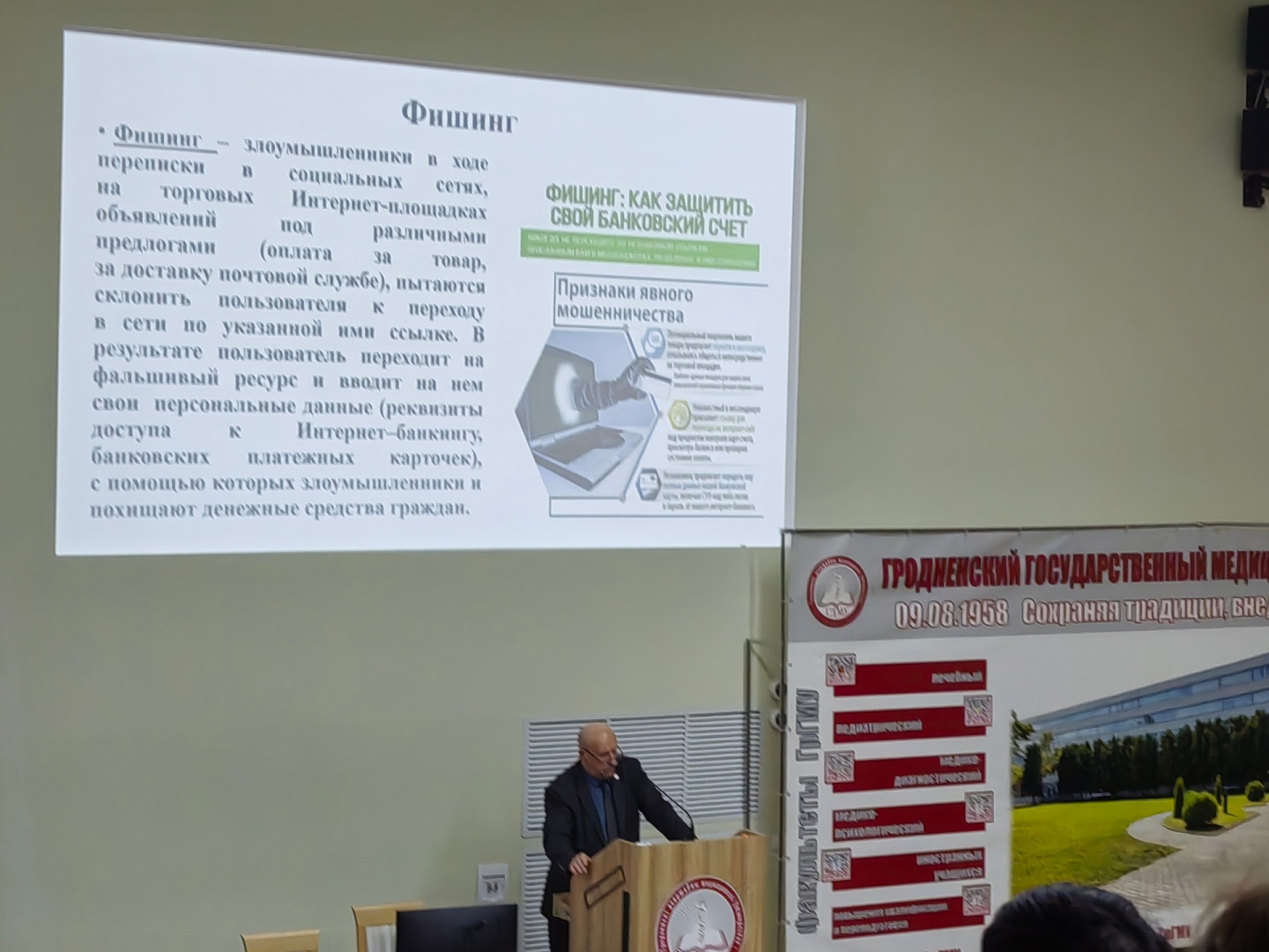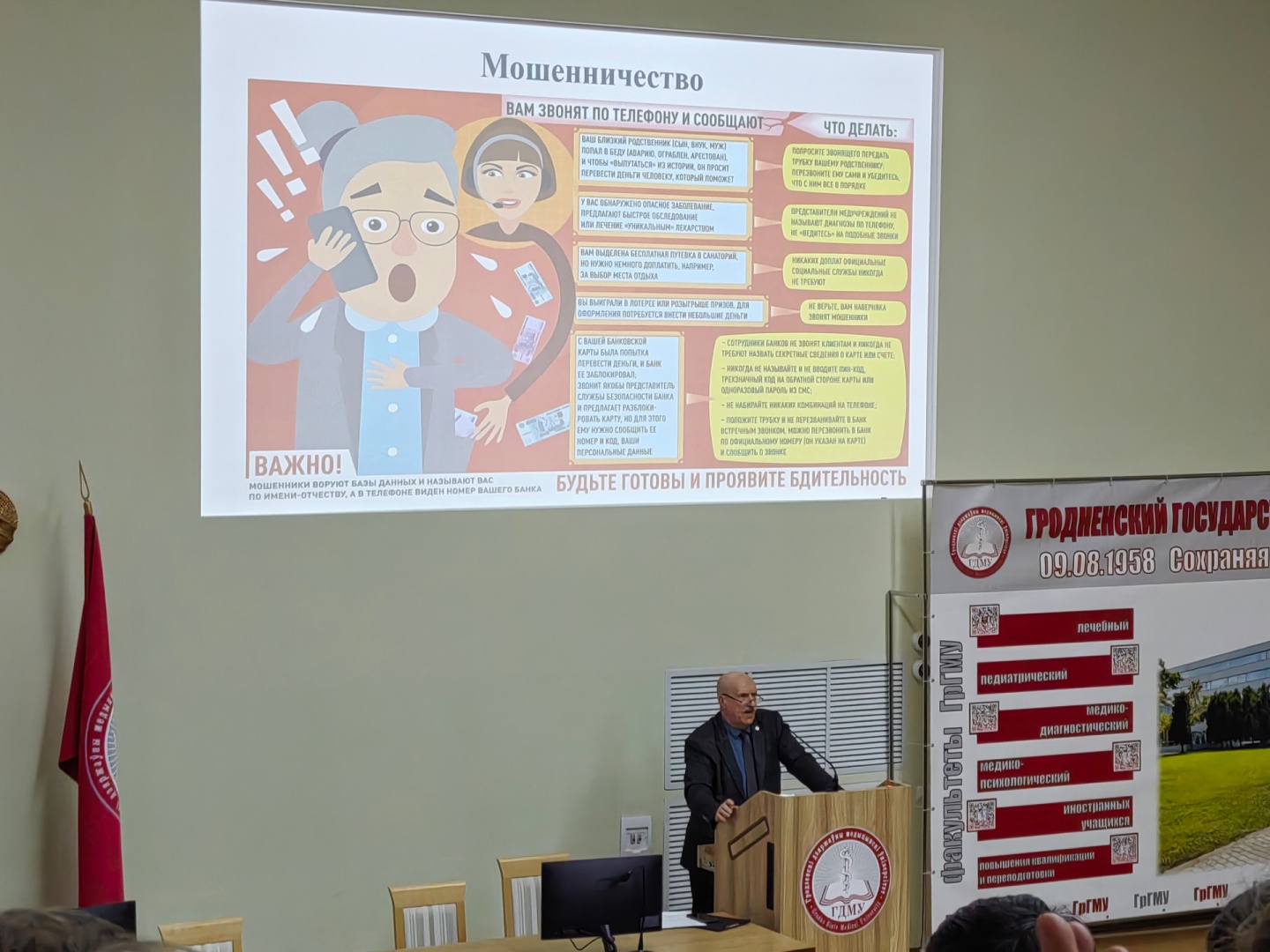 Ст. преподаватель кафедры пропедевтики внутренних болезней Апон Е.И. и студенты кураторских групп присутствовали на мероприятии. Узнали много полезной информации о вариантах мошенничества, а также о том, как важно сохранять бдительность, чтобы не попасть в ловушку.