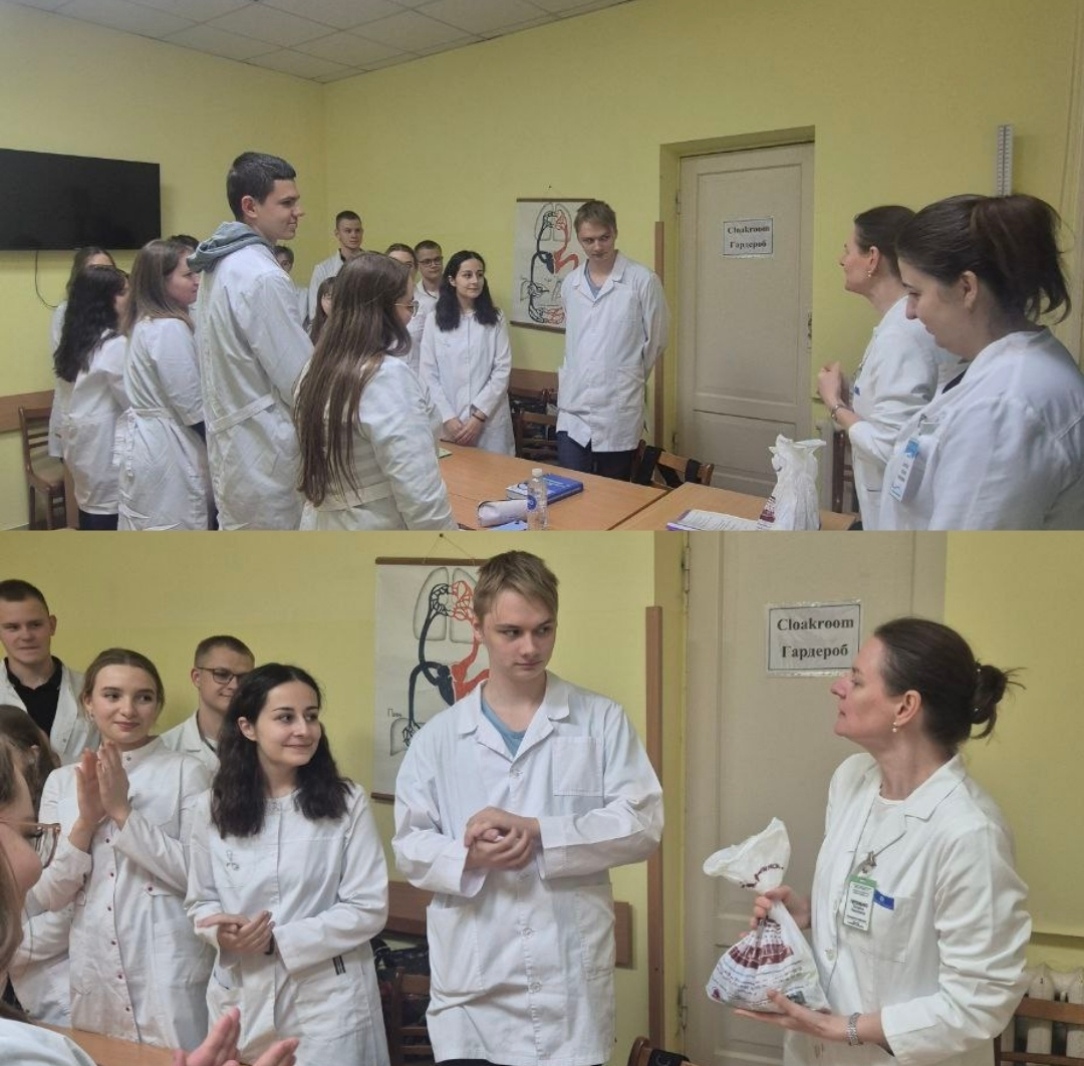 Апон Е.И. представила вниманию учащихся презентацию на тему «Мир профессий. Врач», рассказала об актуальности, особенностях и трудностях профессии, проинформировала об условиях поступления в медуниверситет, а также ознакомила со специальностями, которым обучают в университете. А студенты подготовили юмористический видеоролик о буднях и праздниках жизни студента - медика. Выступление вызвало бурный интерес у учащихся и педагогов.