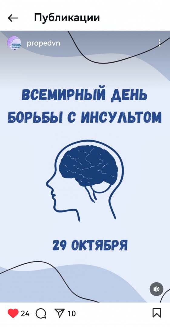 29 октября отмечается Всемирный день борьбы с инсультом. Он был учреждён в 2006 г. Всемирной организацией по борьбе с инсультом. Цель его – привлечение внимания к проблеме мозговых инсультов: вопросам профилактики, своевременной диагностики и лечения.