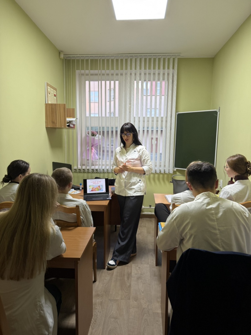 26 февраля 2025 года ассистент кафедры Кучинская В.Е. со студентами педиатрического факультета провела тематическую беседу «Наркотики - это не наш выбор». В рамках которой рассмотрели мифы о наркопотреблении. Позже студенты смогли высказать свои аргументы против потребления, разместив стикеры на тематическом плакате.