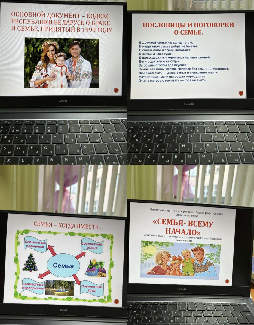 День матери (14 октября) призван поддержать традиции бережного отношения к женщине и подчеркнуть значение матери в нашей жизни. А День отца (21 октября) подчеркивает роль отца в воспитании ребенка и становлении новой личности, является отправной точкой в переосмыслении образа отца в обществе. Единые дни информирования на этой неделе посвящены семье. Их тема – «Семейное воспитание как основа сильного государства». В рамках Недели родительской любви проходили мероприятия на кафедре психиатрии и наркологии.