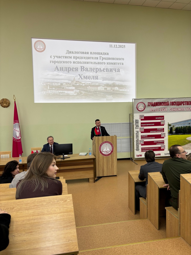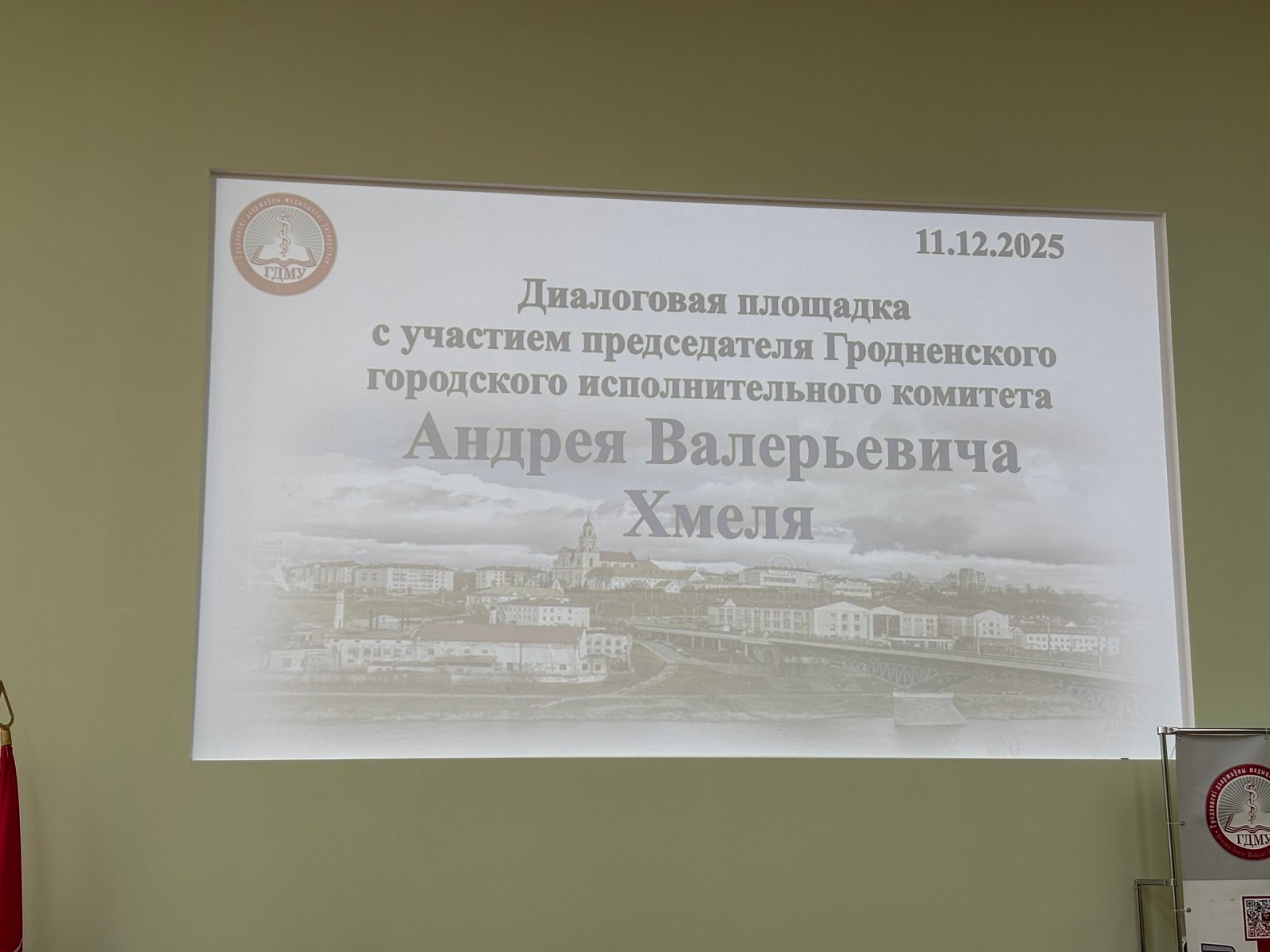 11.12.2025 в Гродненском государственном медицинском университете прошла диалоговая площадка с председателем Гродненского городского исполнительного комитета Андреем Валерьевичем Хмелем. В встрече приняла участие ассистент кафедры Кучинская В.Е. Во время мероприятия обсуждались вопросы благоустройства и перспектив развития нашего города.