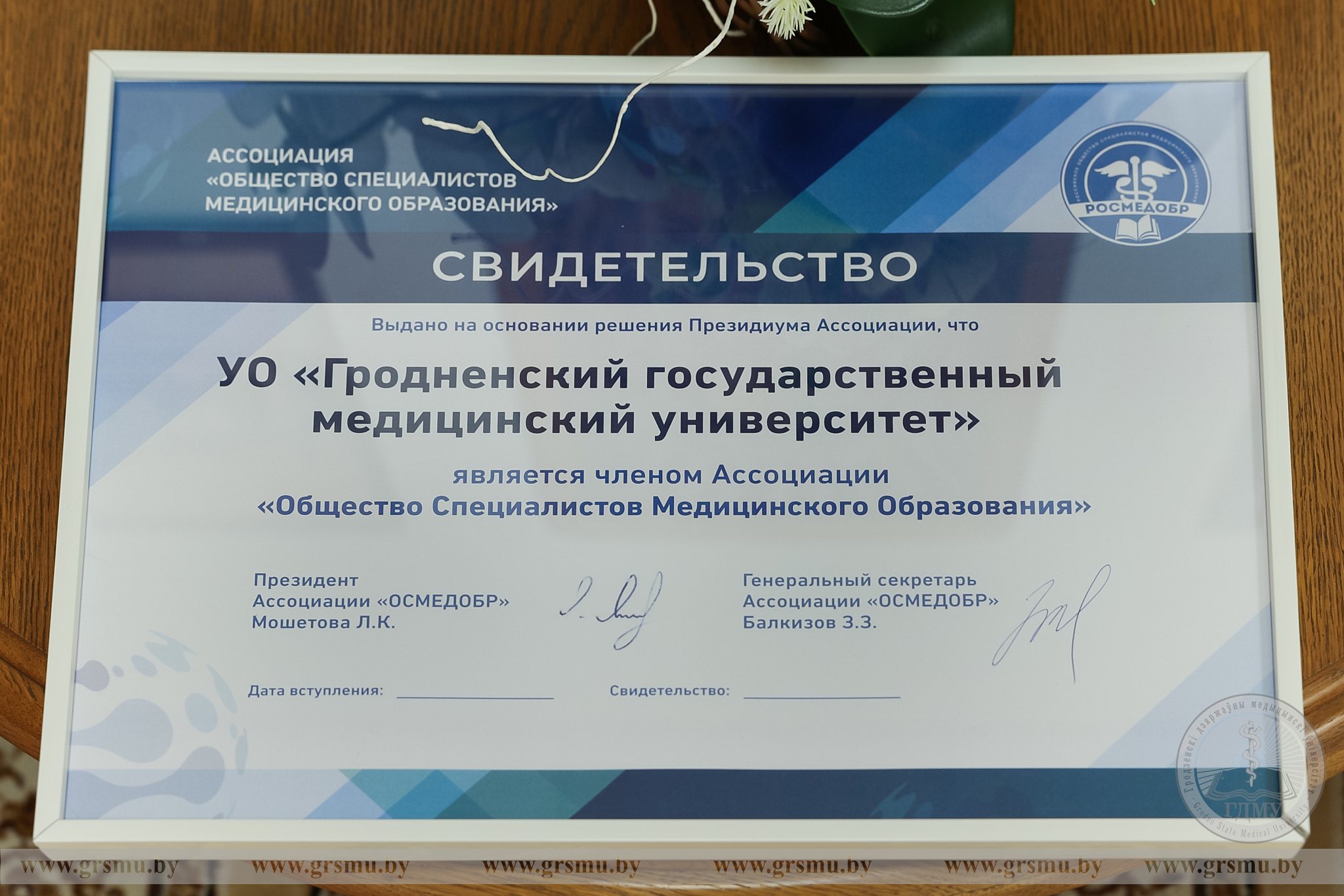 Залим Замирович Балкизов, директор института подготовки специалистов медицинского образования ФГБОУ ДПО «Российская медицинская академия непрерывного профессионального образования» Министерства здравоохранения Российской Федерации, Генеральный секретарь Российского общества специалистов медицинского образования, профессор кафедры организации профессионального образования и образовательных технологий ФГАОУ ВО «Российский национальный исследовательский медицинский университет имени Н.И.Пирогова» Министерства здравоохранения РФ, торжественно вручил ректору ГрГМУ Игорю Георгиевичу Жуку свидетельство о членстве УО «Гродненский государственный медицинский университет» в Ассоциации «Общество Специалистов Медицинского Образования» (РОСМЕДОБР).