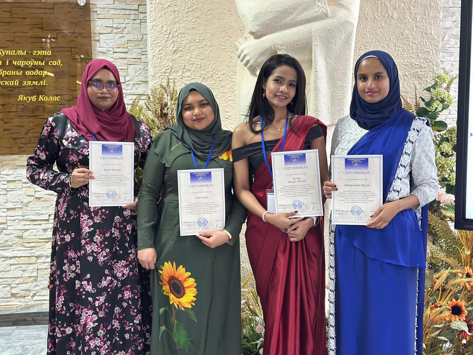 На конкурсе чтецов стихотворений «Мой родны кут, як ты мне мілы» жюри определяло лучших в 3 номинациях: «Глубина художественного слова», «Адданасць традыцыі», «Самое эмоциональное выступление». Наши конкурсанты Магумба Фенелла Юсайд (3 курс 2а группа), Эдирисингхе Джитмини Онали (3 курс 8а группа), Атапатту Мудиянселаге Куласекара Сандуни Ануттара (4 курс 2а группа) получили дипломы.