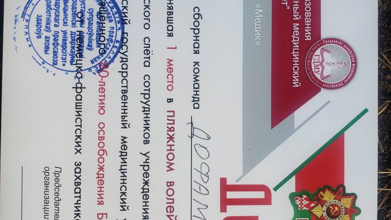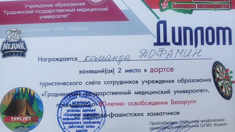 Команда взяла первое место по пляжному волейболу, благодаря слаженной работе Фурс Виктории Валерьевны (кафедра акушерства и гинекологии) и Шулейко Олега Борисовича (кафедра медицинской реабилитации), в дартсе мы были вторыми благодаря Климович Екатерине Анатольевне (кафедра психотерапии и клинической психодиагностики), Кулеш Сергей Демьянович (кафедра неврологии и нейрохирургии) занял 2 место в настольном теннисе среди мужчин.