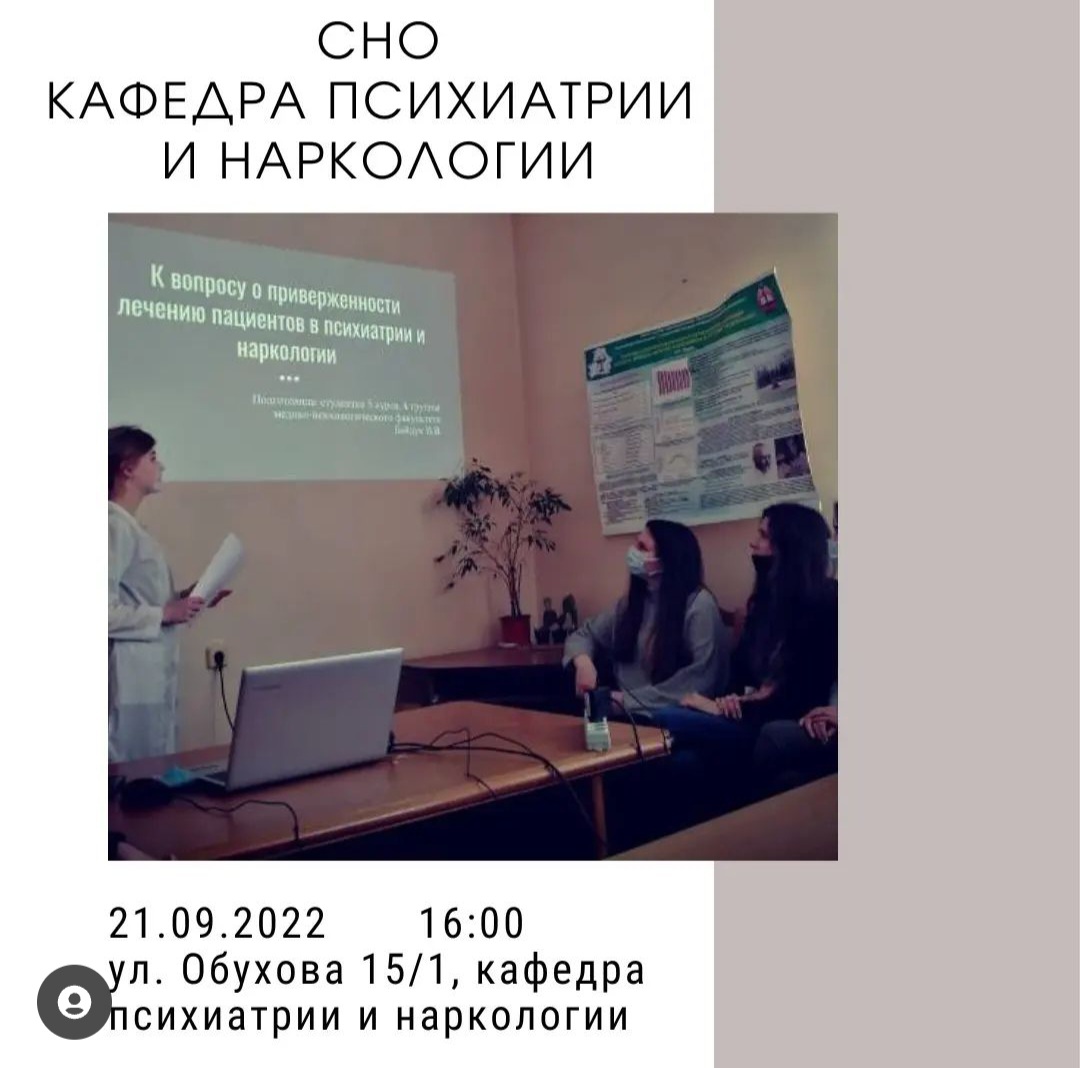 Если вы думаете, на какой кафедре сделать первые (а может быть уже и не первые) шаги в науку, то смело приходите на первое заседание СНО кафедры психиатрии и наркологии, на котором вы познакомитесь с преподавательским составом кафедры и сферой их научных интересов, а, главное, сможете выбрать себе научного руководителя, с которым будете покорять олимп науки.