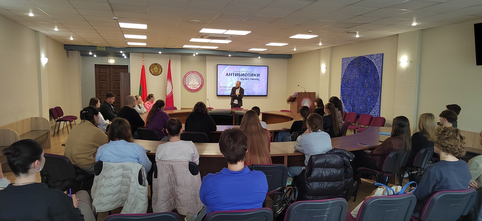 Вечер среды 17.09.2025 был заполнен увлекательной лекцией по антибиотикам. На лекции были студентов всех факультетов от 1 до 6 курса, а также преподаватели, которые с огромным удовольствием углубились в особенности антибиотикотерапии. Встреча совместила в себе интерактивность, общение с аудиторией и лаконично поданный материал, что стало важным этапом для каждого присутствующего в формировании своей профессиональной компетенции.