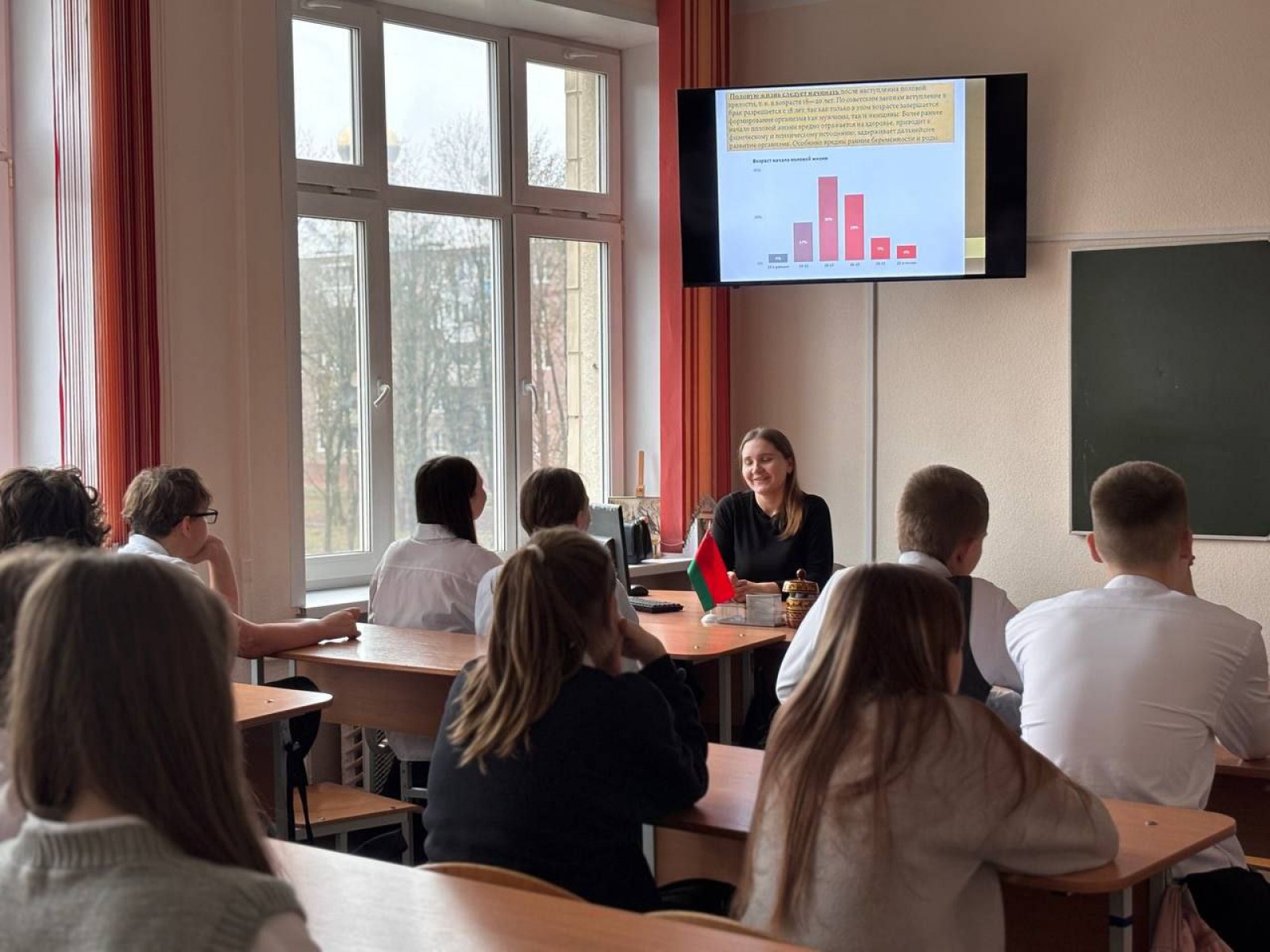 Студентки 4 курса Лелюкова Анастасия и Щёлок Ульяна, а также студентки 5 курса Хаткевич Иллария и Каукялис Валерия выстроили разговор так, чтобы старшеклассники получили не набор «страшилок», а понятную систему знаний. Обсудили гигиену половых отношений, разобрали современные методы контрацепции — от принципов действия до надёжности и ключевых правил применения — и подчеркнули главное: средства выбираются индивидуально, а ответственность за репродуктивное здоровье начинается с грамотных решений и уважения к себе и партнёру.
