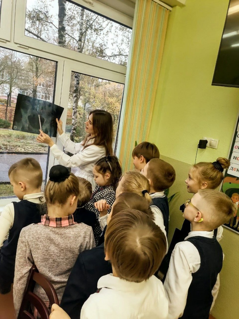 Ранняя анатомия (23.10): Студентка Быковская Софья (5 курс) провела занятие "Скелет - моя опора" для второклассников, используя сказку о переломах и изучение настоящего рентген-снимка для наглядности.