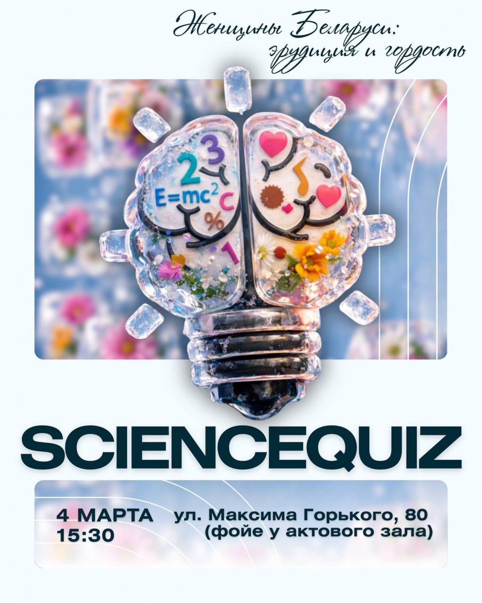 Приглашаем на первую весеннюю игру «Женщины Беларуси: эрудиция и гордость»! В преддверии праздника, подготовили для вас вопросы, касающиеся роли женщин в истории науки, технологий и культуры. Никаких стереотипов - только чистая наука, увлекательные факты и командный замес. Будем удивляться, спорить и узнавать новое о мире, который создавали все.