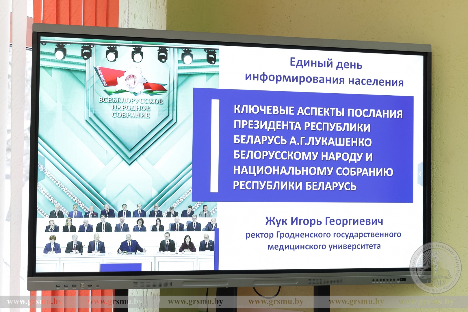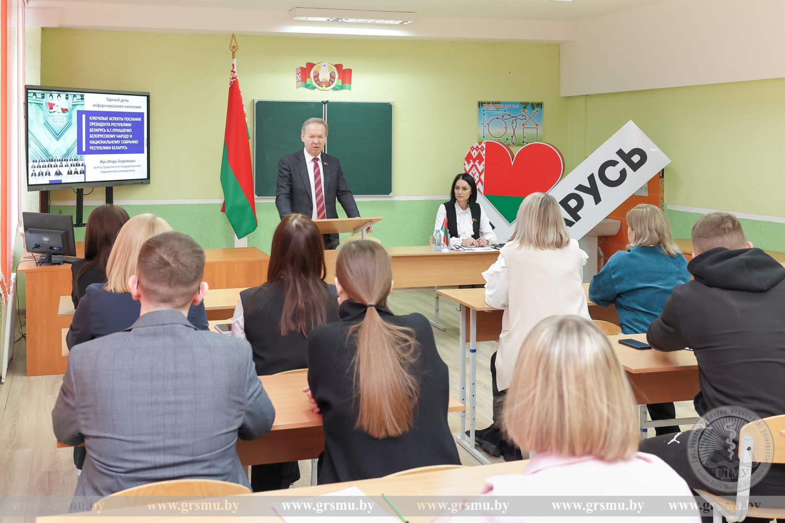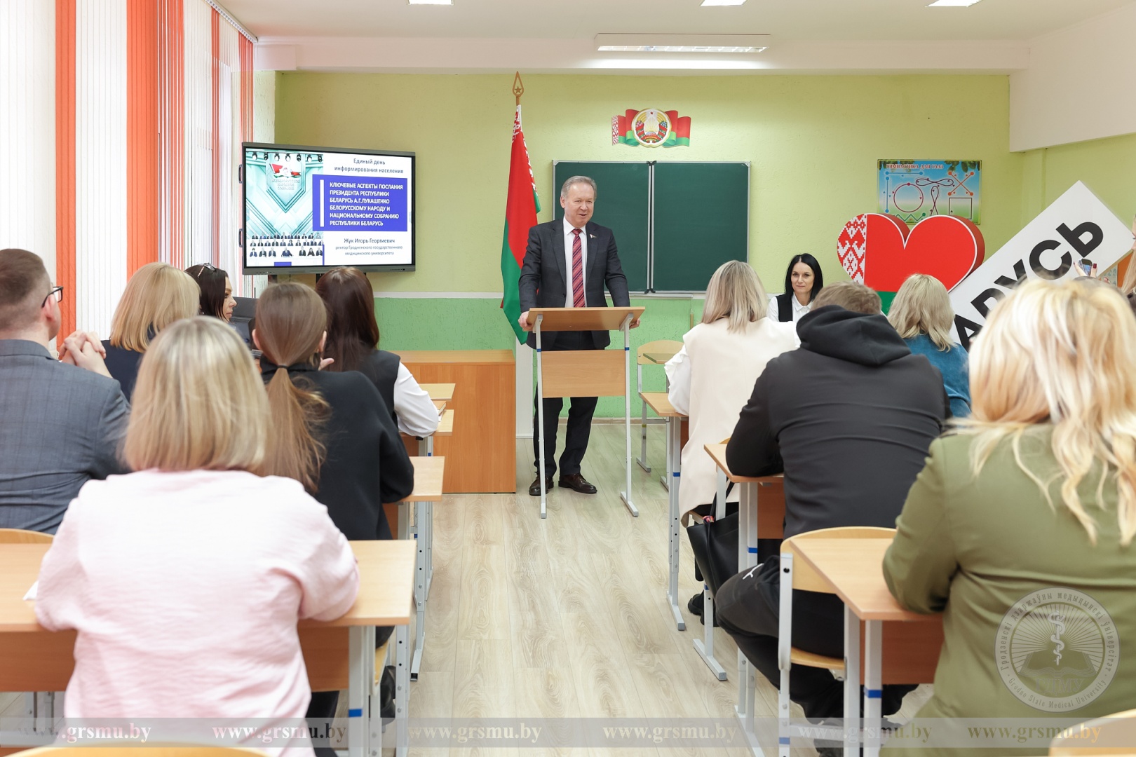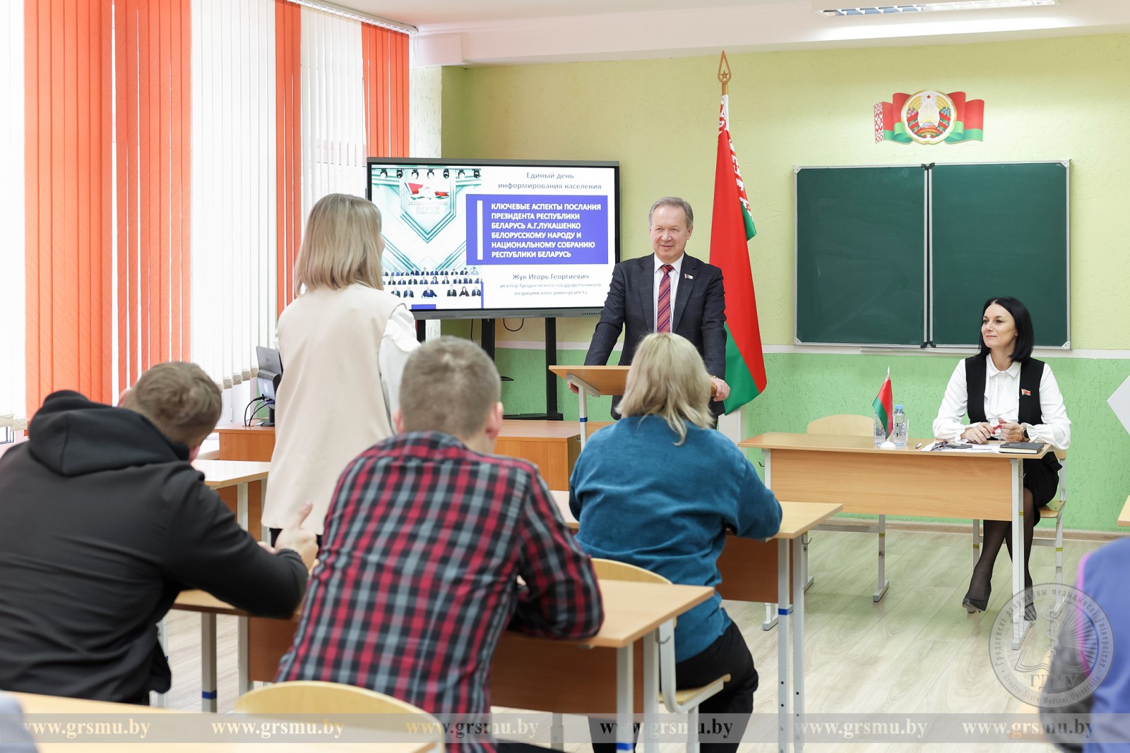 В рамках единого дня информирования, который традиционно проходит каждый третий четверг месяца, ректор Гродненского государственного медицинского университета, делегат VII Всебелорусского народного собрания Игорь Георгиевич Жук встретился с трудовым коллективом гимназии № 6 имени Ф. Э. Дзержинского города Гродно. Главной темой встречи стало обсуждение ключевых аспектов Послания Президента Республики Беларусь Александра Григорьевича Лукашенко белорусскому народу и Национальному собранию Республики Беларусь.