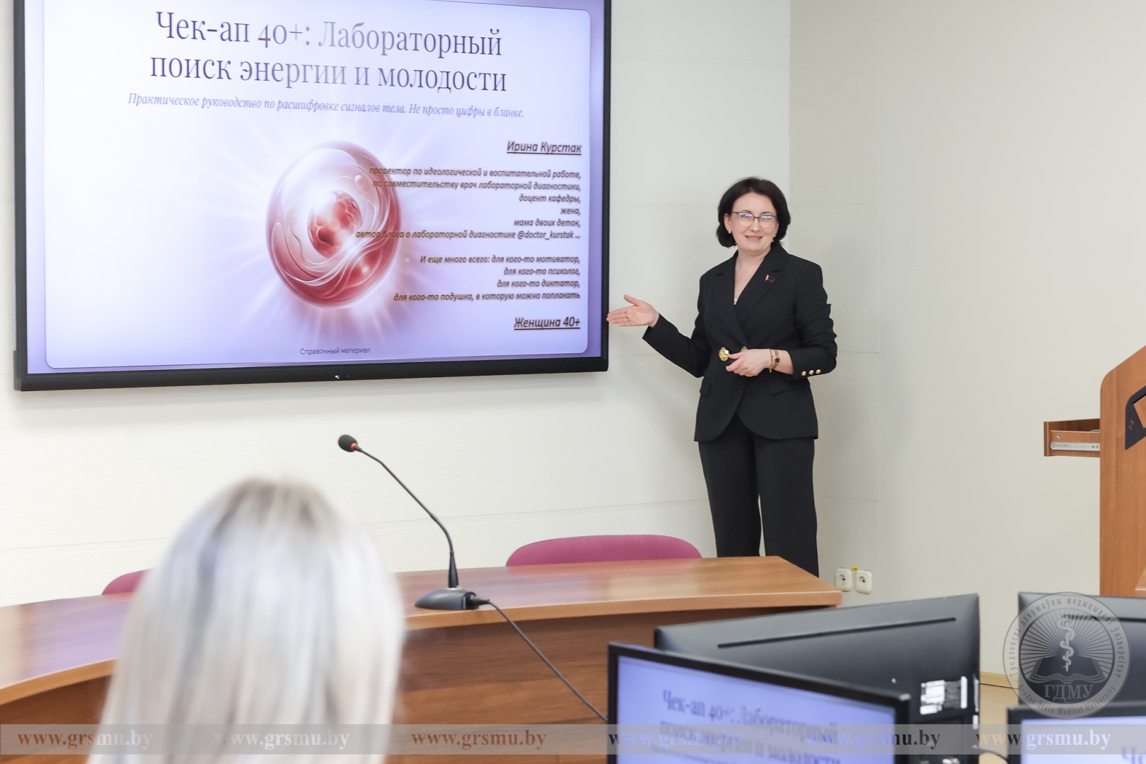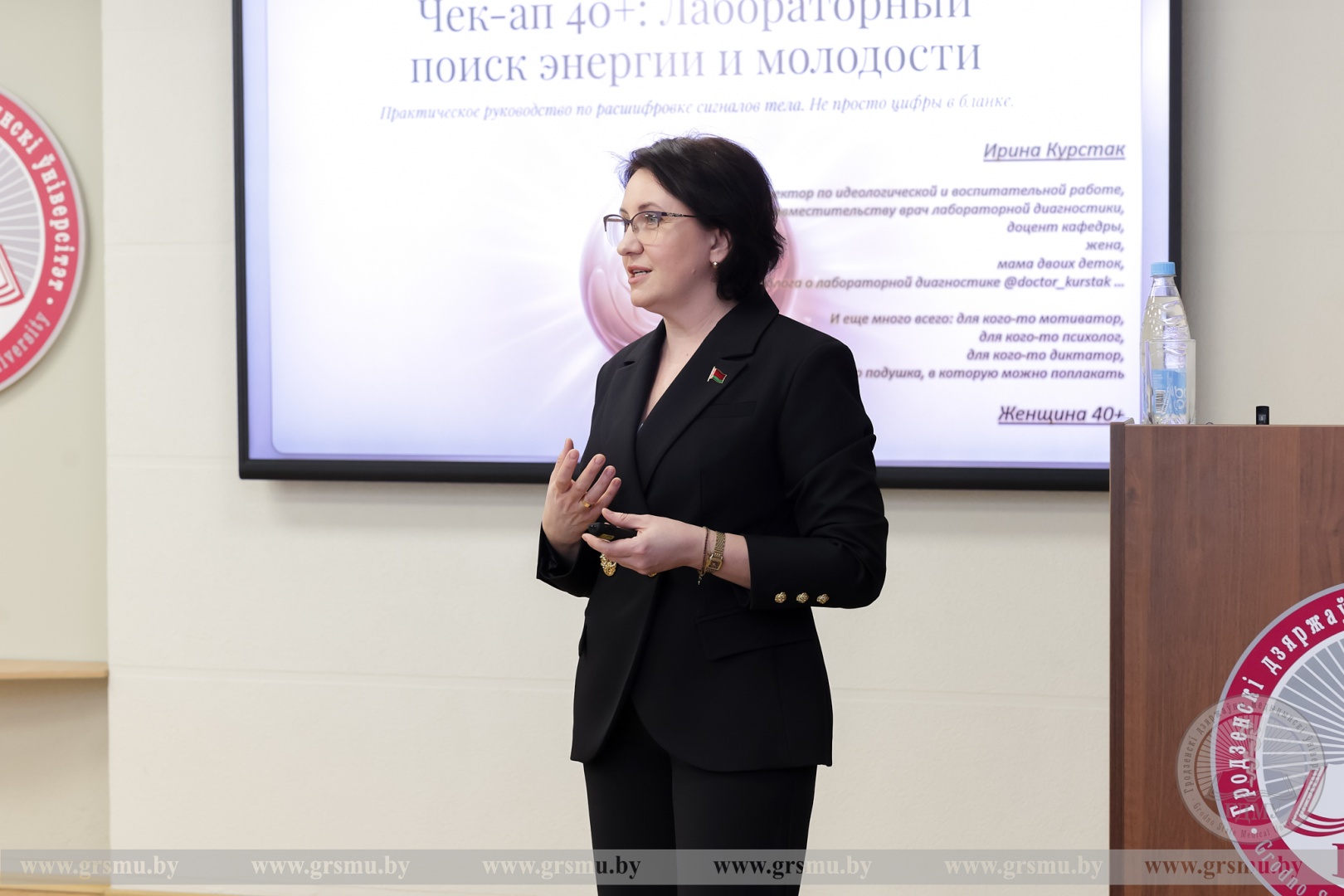 Первая лекция на тему «Чек‑ап 40+: лабораторный поиск энергии и молодости» в рамках проекта прошла с большим успехом. Спикером выступила проректор по идеологической и воспитательной работе, кандидат медицинских наук, доцент, врач клинической лабораторной диагностики высшей категории – специалист, чей опыт и знания позволили раскрыть тему максимально глубоко и практично, – Ирина Андреевна Курстак.
