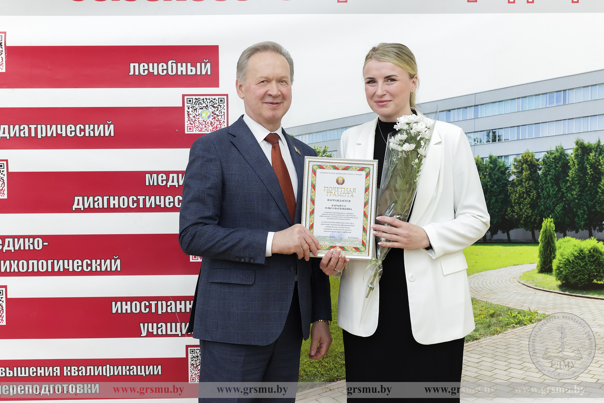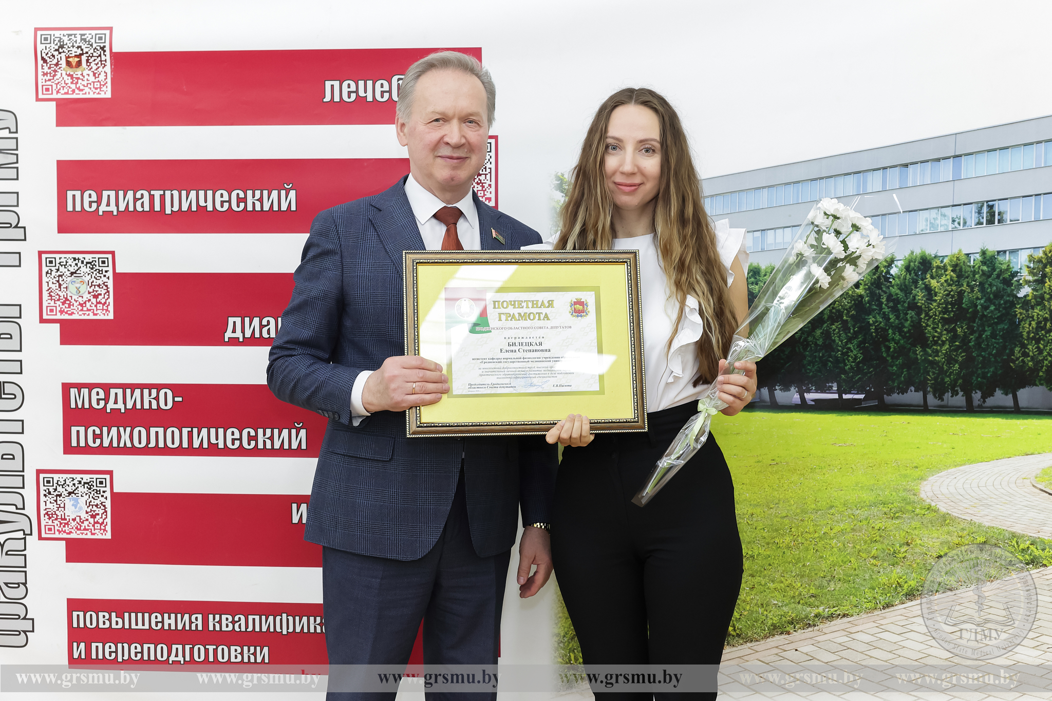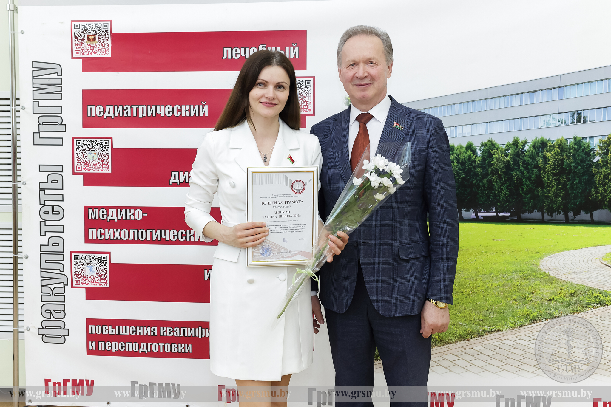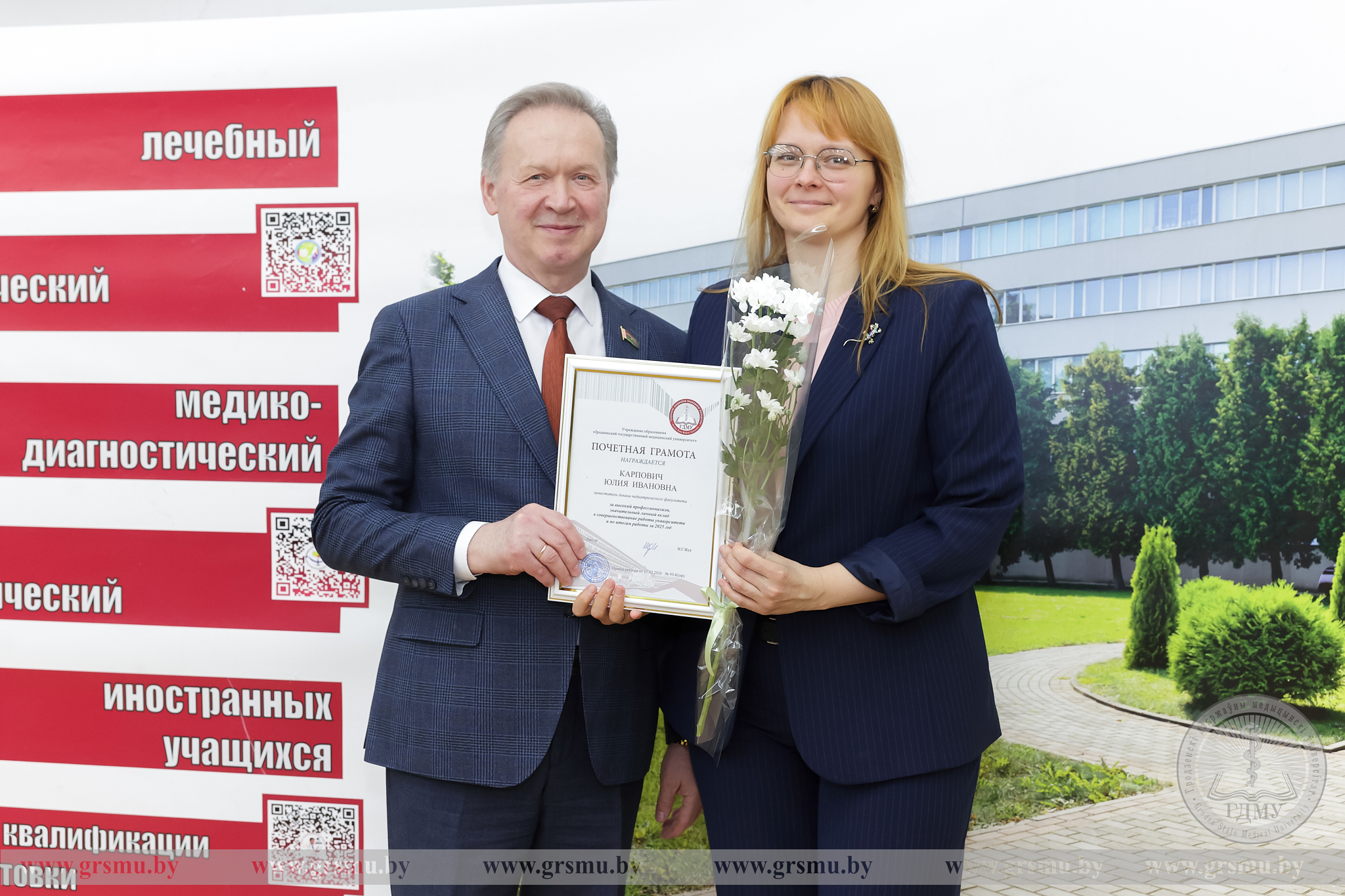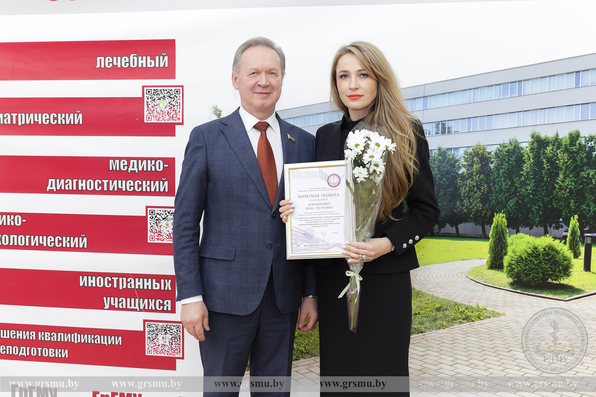 За плодотворное сотрудничество, содействие в интеграции образовательного, научного и лечебного процессов, взаимодействие в деле подготовки высококвалифицированных специалистов-медиков Почетной грамотой учреждения образования «Гродненский государственный медицинский университет» награждены главный врач учреждения здравоохранения «Гродненский областной эндокринологический диспансер» Инна Петровна Дорошкевич, заместитель главного врача по медицинской части учреждения здравоохранения «Городская клиническая больница №4 г. Гродно» Сергей Владимирович Колешко, врач лучевой диагностики учреждения здравоохранения «Гродненская университетская клиника» Андрей Валерьевич Прокопович, врач-рентгенэндоваскулярный хирург ангиографического кабинета учреждения здравоохранения «Гродненская университетская клиника» Сергей Петрович Антоненко.