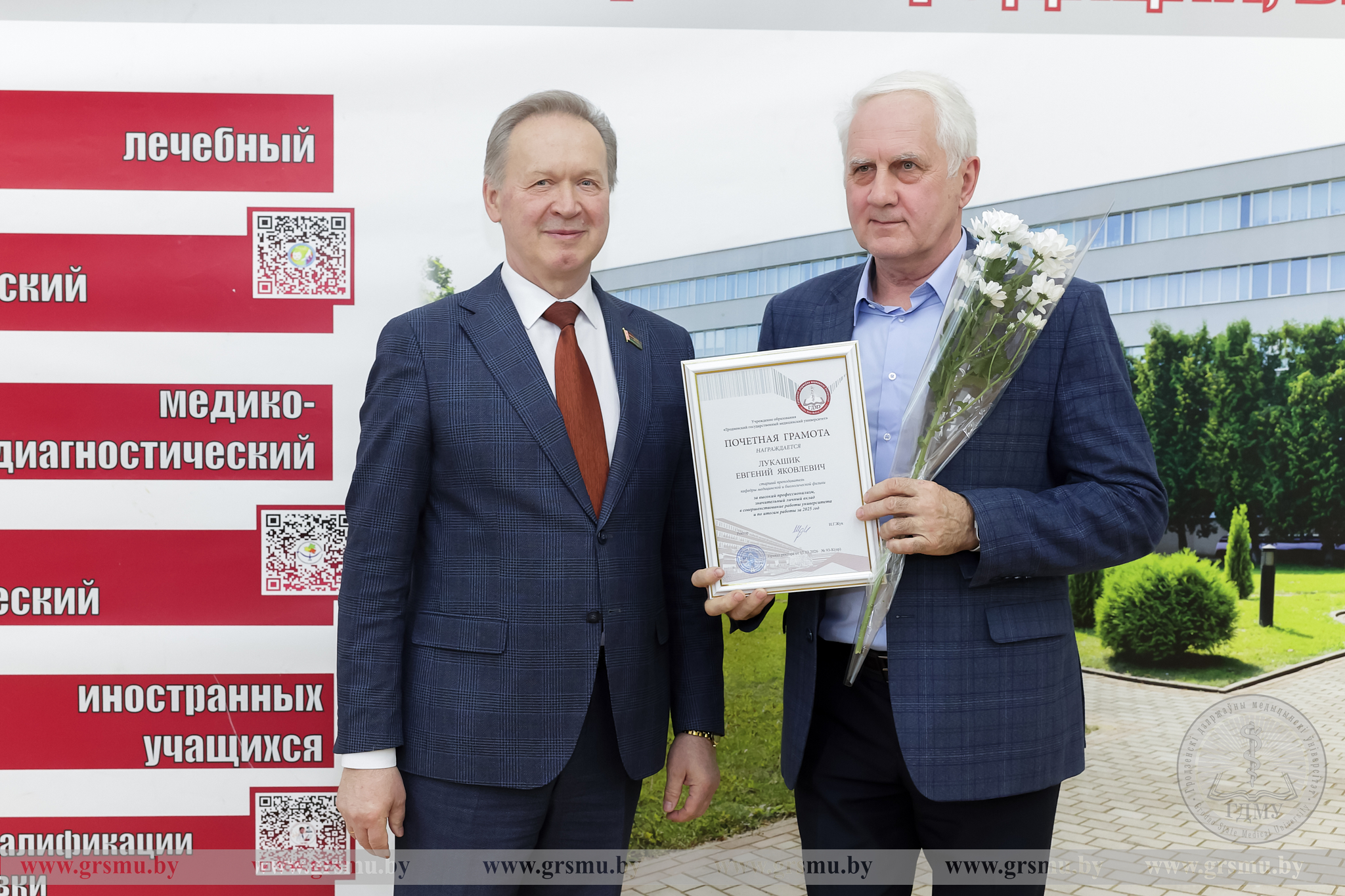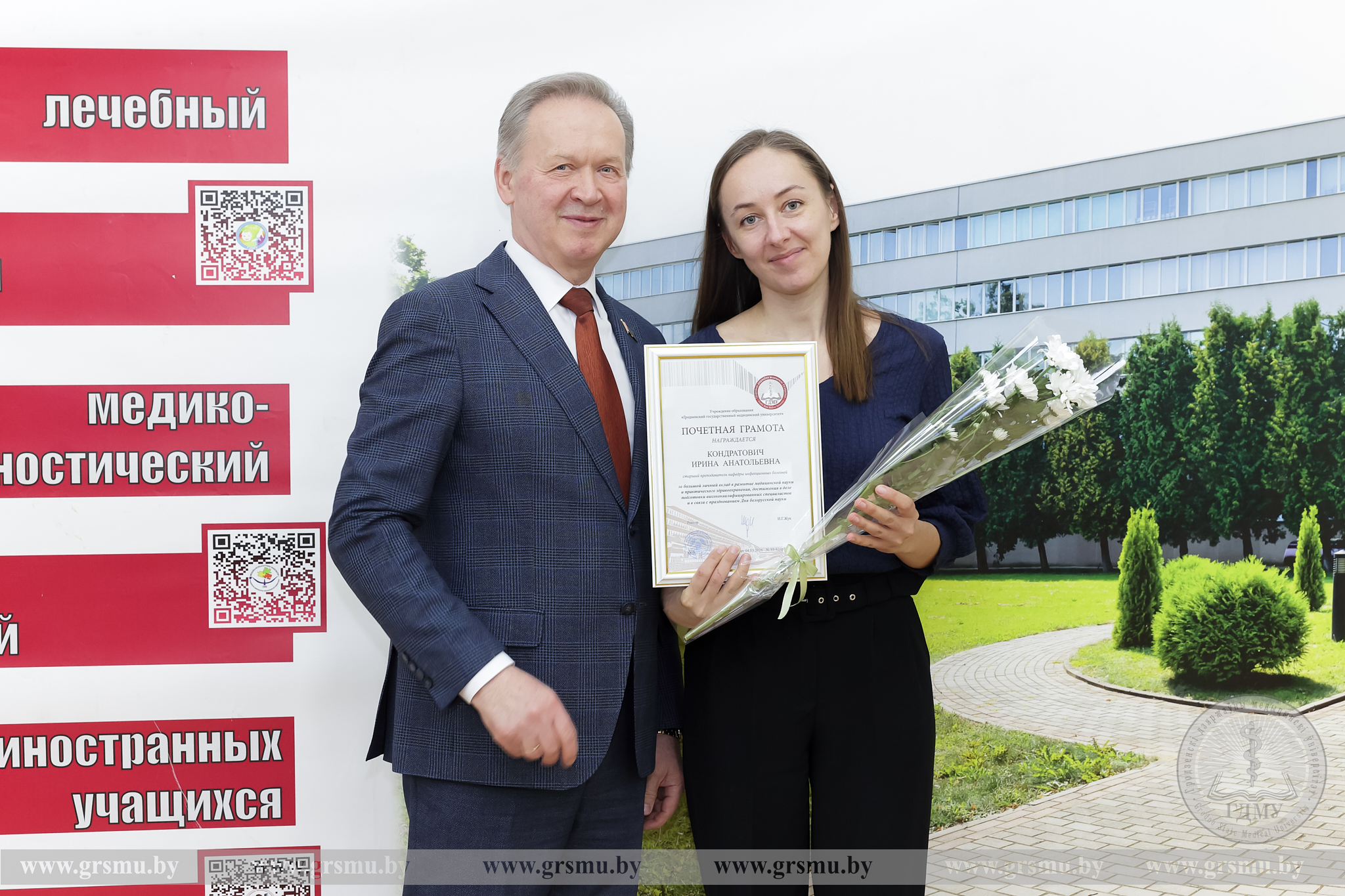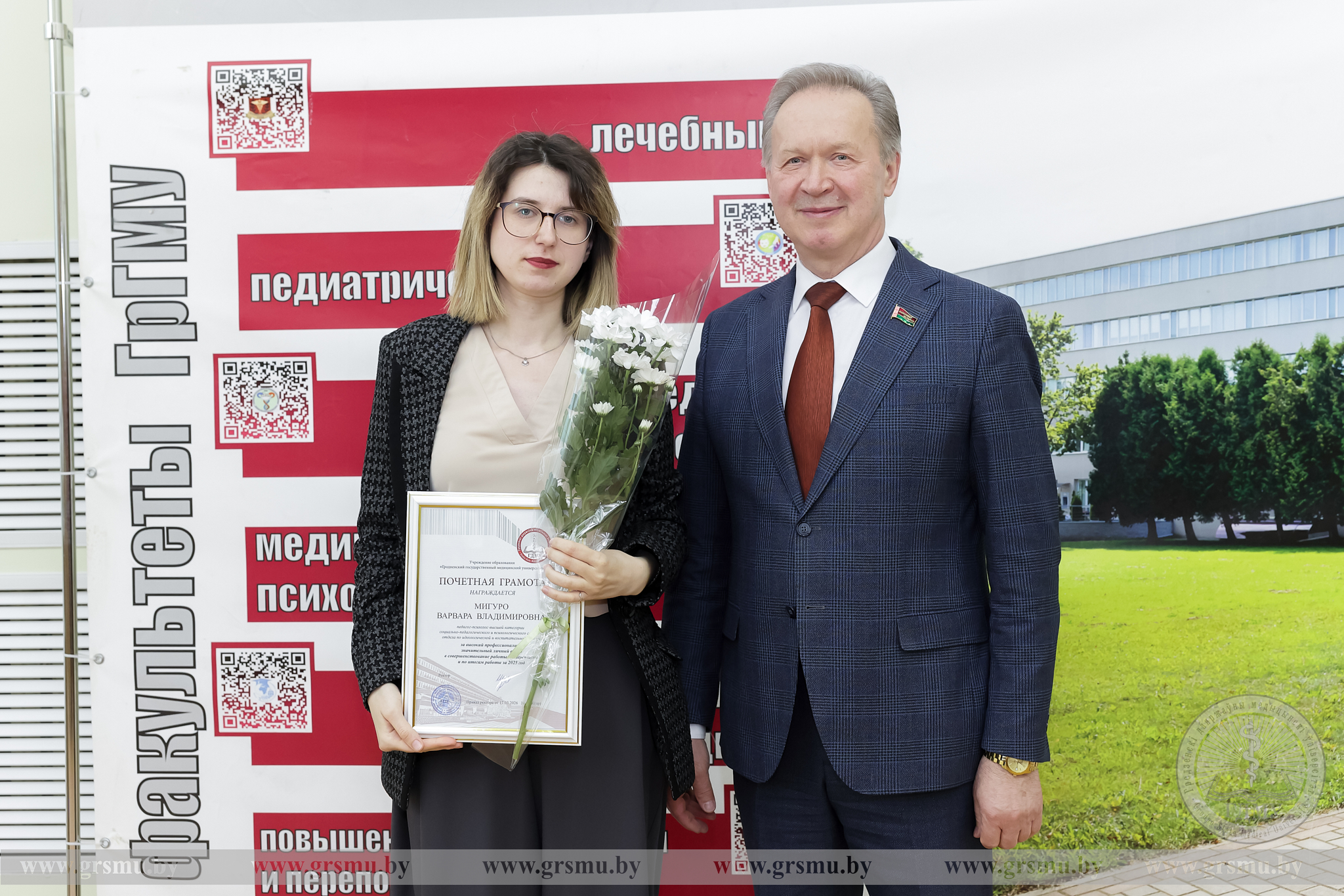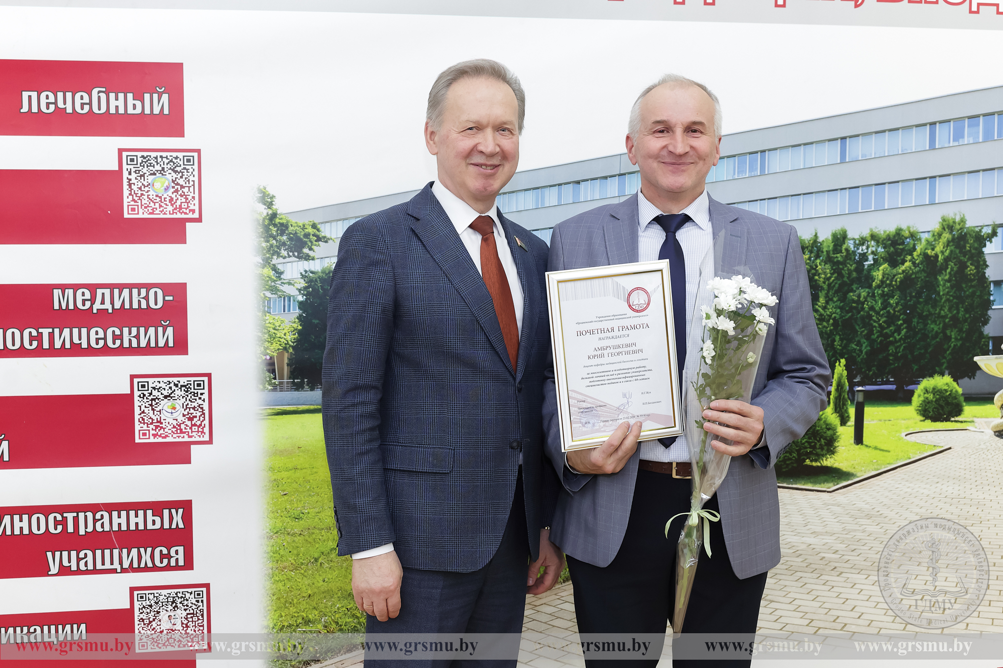 За плодотворное сотрудничество, содействие в интеграции образовательного, научного и лечебного процессов, взаимодействие в деле подготовки высококвалифицированных специалистов-медиков Почетной грамотой учреждения образования «Гродненский государственный медицинский университет» награждены главный врач учреждения здравоохранения «Гродненский областной эндокринологический диспансер» Инна Петровна Дорошкевич, заместитель главного врача по медицинской части учреждения здравоохранения «Городская клиническая больница №4 г. Гродно» Сергей Владимирович Колешко, врач лучевой диагностики учреждения здравоохранения «Гродненская университетская клиника» Андрей Валерьевич Прокопович, врач-рентгенэндоваскулярный хирург ангиографического кабинета учреждения здравоохранения «Гродненская университетская клиника» Сергей Петрович Антоненко.