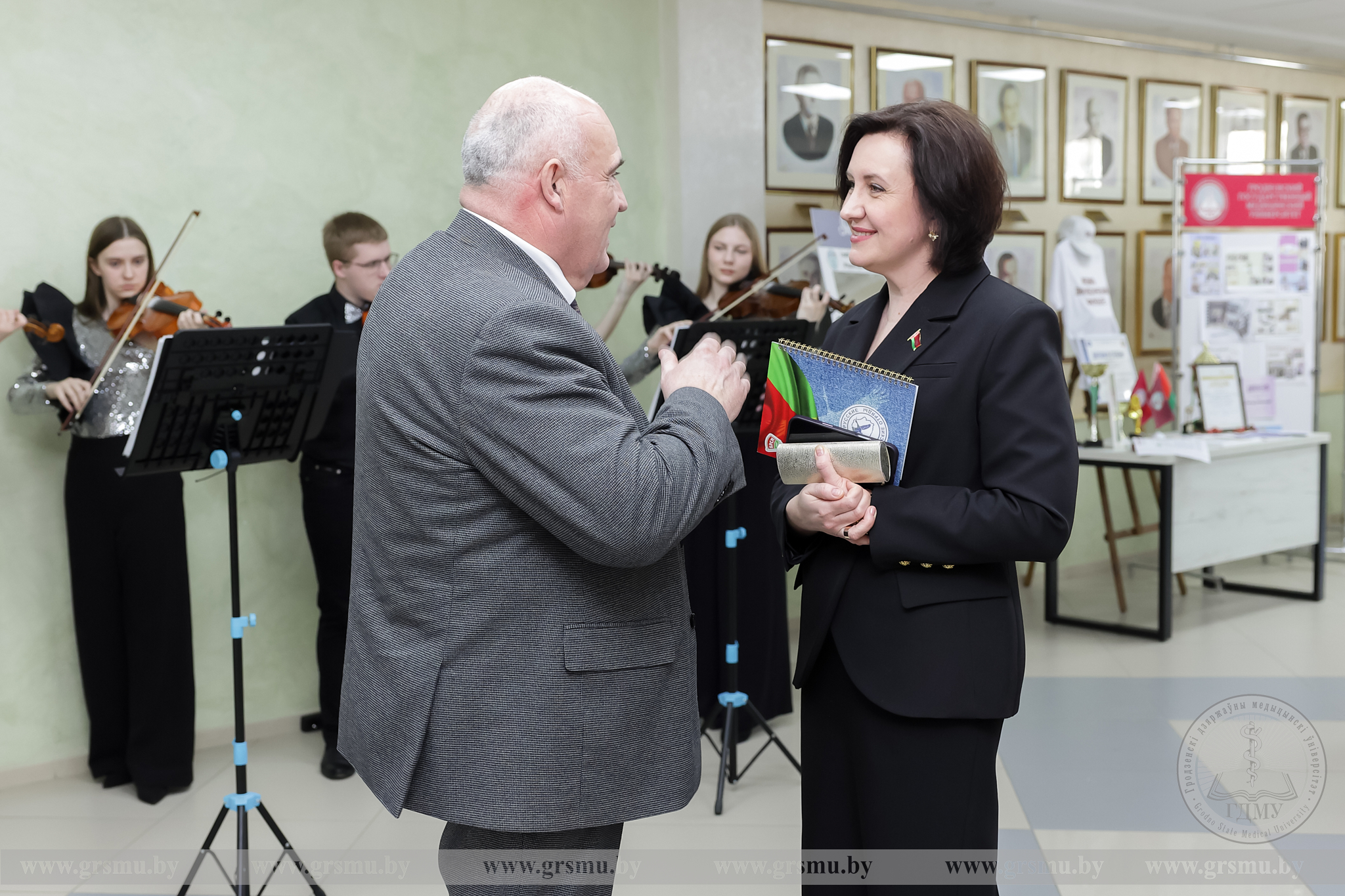 Председатель Гродненской областной организации Белорусского профсоюза работников здравоохранения Владислав Робертович Голяк от имени организации вручил сотрудникам вуза награды. За большой личный вклад в развитие профсоюзного движения, за большой личный вклад в защиту трудовых прав и социально-экономических интересов членов профсоюза, повышение имиджа отраслевого профсоюза, а также за добросовестный труд и по итогам учебной, научно-исследовательской, лечебной, идеологической и воспитательной работы учреждения образования «Гродненский государственный медицинский университет» за 2025 год Почётной грамотой награждены старший преподаватель кафедры нормальной анатомии Татьяна Валерьевна Татун, повар 1-го разряда столовой Татьяна Викторовна Бабко и ответственный за работу читального зала и абонемента научной литературы библиотеки ГрГМУ Наталья Николаевна Ильина.