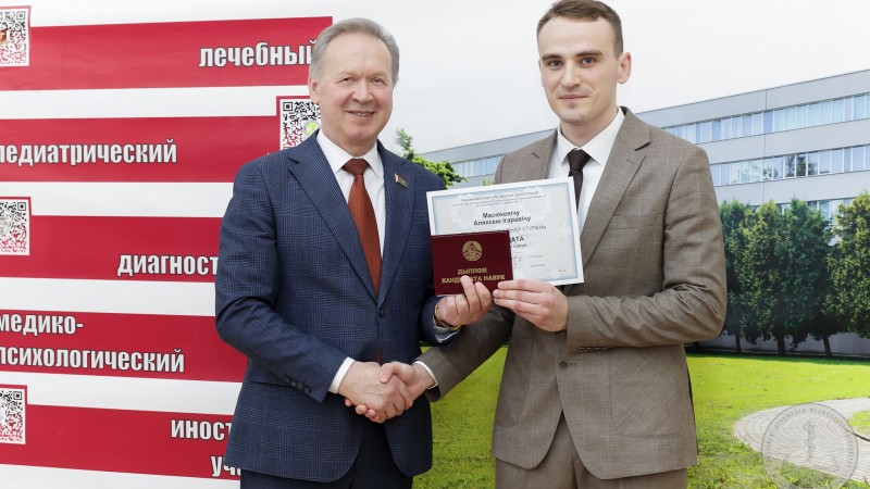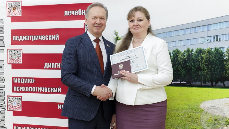 Также в рамках совета ассистенту 1-й кафедры хирургических болезней Олегу Владимирович Панасюка, ассистенту кафедры общей хирургии Алексею Игоревичу Масюкевич, ассистенту кафедры оториноларингологии и глазных болезней Людмиле Анатольевне Черняк вручили документы о присвоении ученой степени кандидата медицинских наук решением Президиума ВАК. Документы о присвоении ученого звания доцента вручены доценту кафедры оториноларингологии и глазных болезней, кандидату медицинских наук Жанне Михайловне Кринец, доценту 1-й кафедры внутренних болезней, кандидата медицинских наук Татьяну Игоревну Балабанович, доценту кафедры общей врачебной практики и поликлинической терапии, кандидату медицинских наук Дмитрию Викторовичу Пицко. Игорь Георгиевич поблагодарил ученых за проделанную высокую работу и пожелал дальнейших научных успехов.