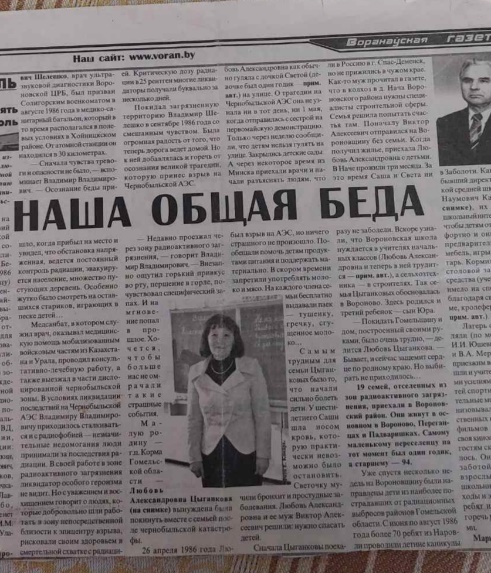 В газете «Вороновская газета» есть материал под названием «НАША ОБЩАЯ БЕДА». Среди его героев – семья из городского посёлка Корма Гомельской области. Интервью корреспонденту газеты даёт Любовь Александровна – мама Светланы Викторовны Бизюкевич.