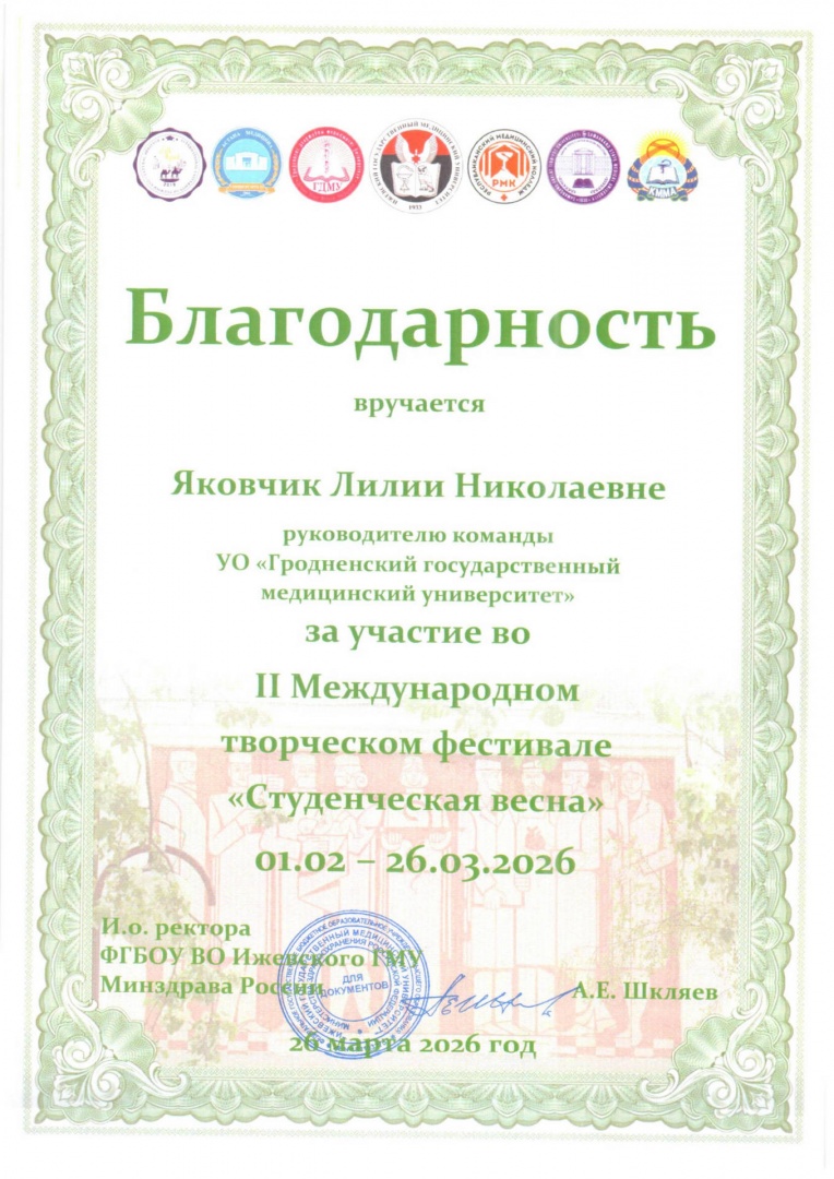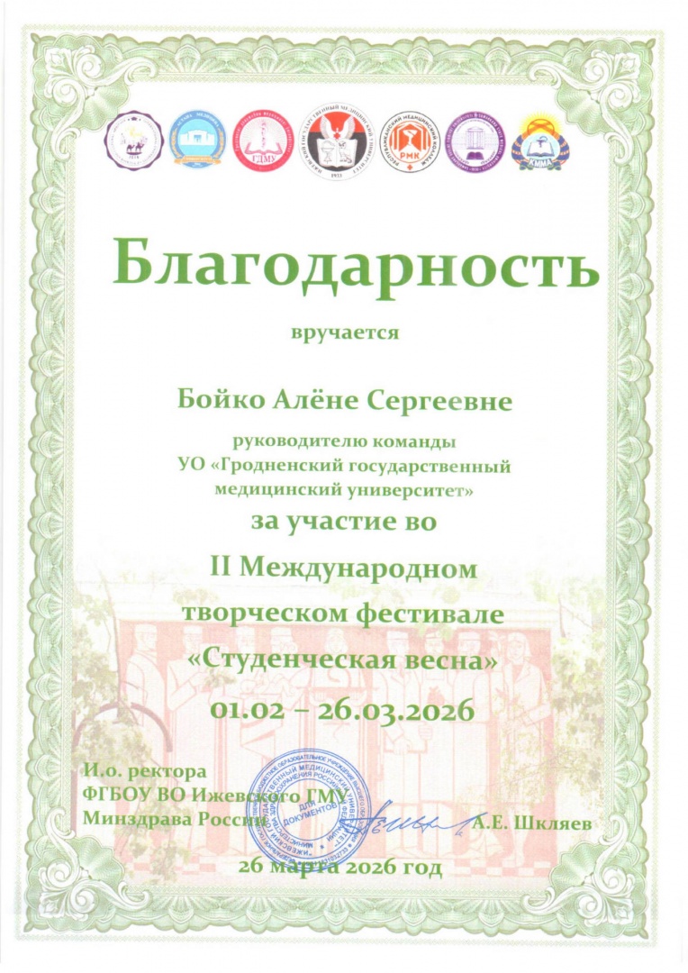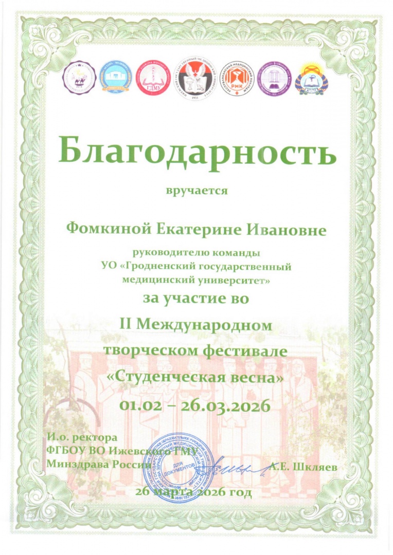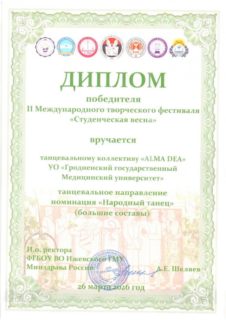 Подведены итоги II Международного творческого фестиваля «Студенческая весна», организатором которого являлось Федеральное государственное бюджетное образовательное учреждение высшего образования «Ижевский государственный медицинский университет» Министерства здравоохранения Российской Федерации. По результатам оценки конкурсных видеоработ, сразу два наших творческих коллектива удостоились высших наград.