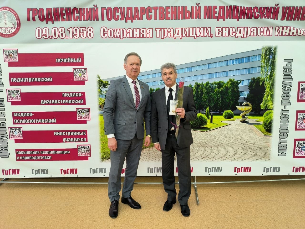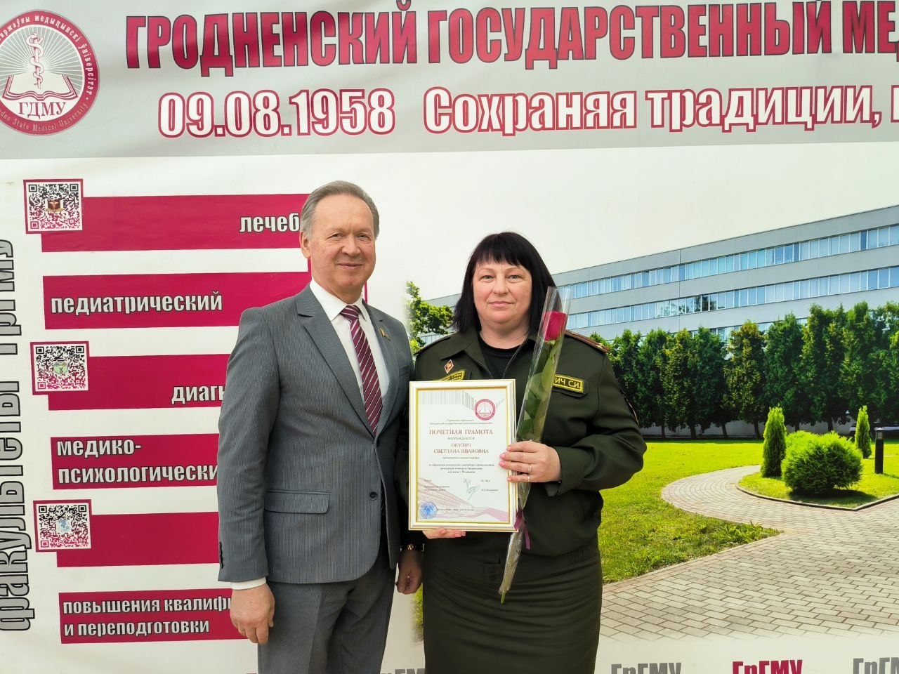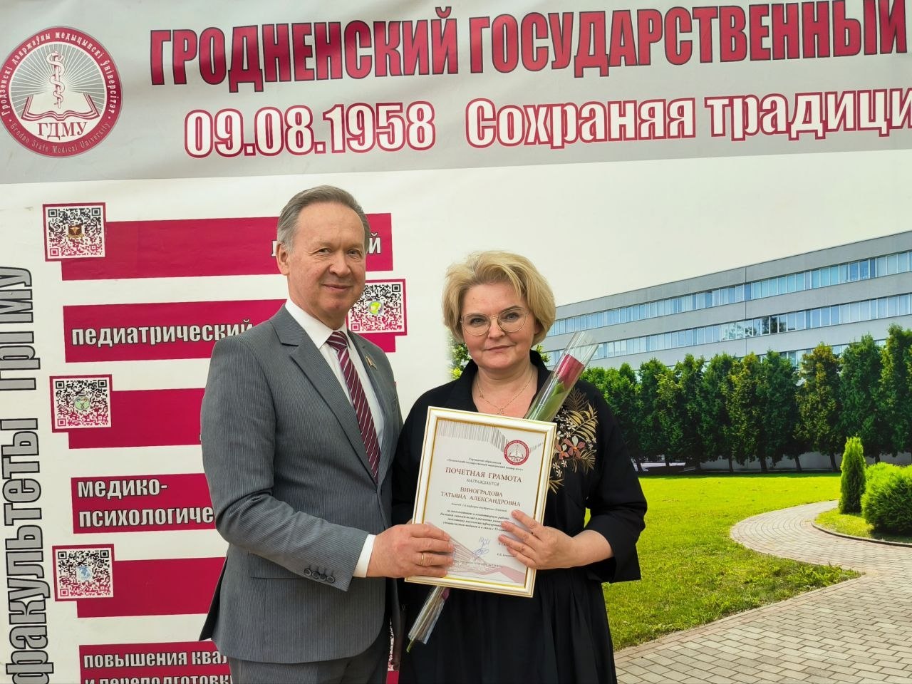 Также в рамках совета университета были награждены юбиляры вуза. Почетная грамота учреждения образования «Гродненский государственный медицинский университет» вручена доценту 2‑й кафедры внутренних болезней Татьяне Александровне Виноградовой, преподавателю военной кафедры Светлане Ивановне Окулич.
