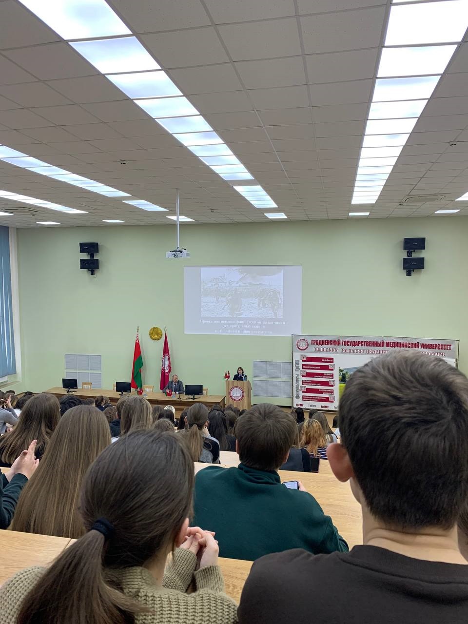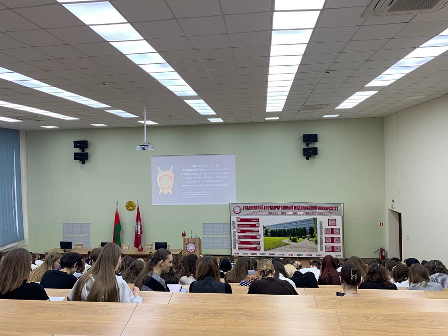 20.03.2026 г. старшие преподаватели кафедры иностранных языков (Шевчик-Гирис Е.М., Мацкевич М.А. и Семенчук И.В.) прослушали доклад прокурора следственной группы прокуратуры Гродненской области Змитревич Н.Н. на тему «Ход и результаты расследования уголовного дела о геноциде белорусского народа в годы Великой Отечественной войны: восстановление исторической справедливости».