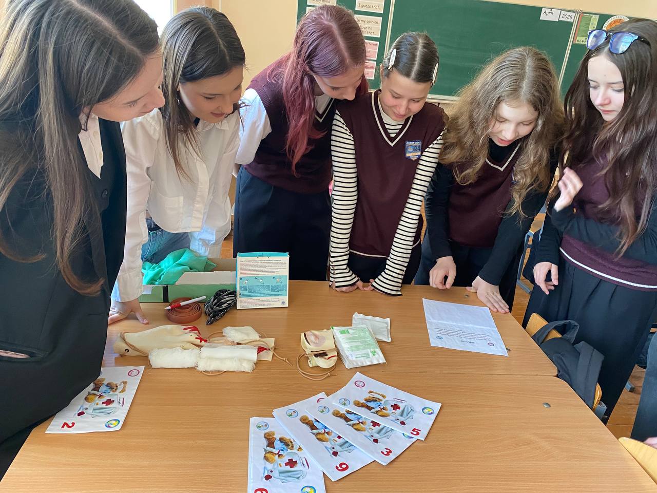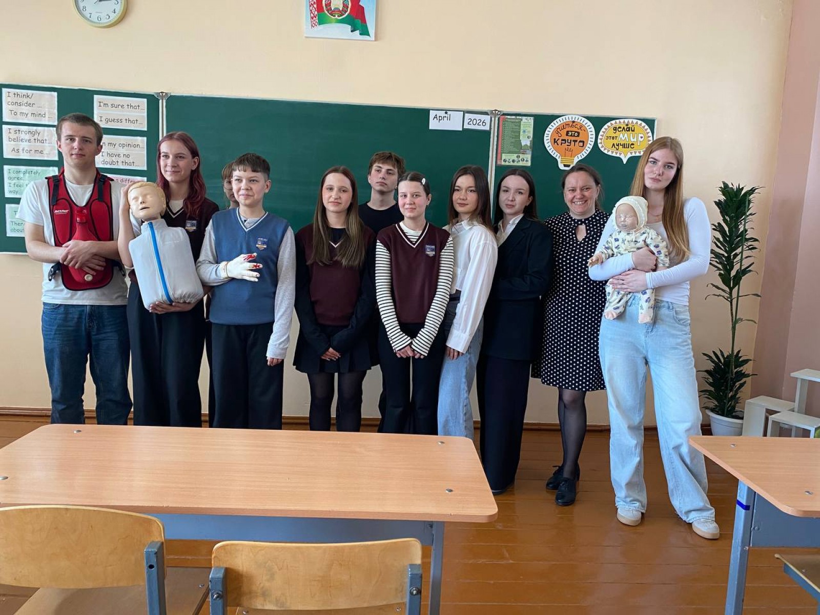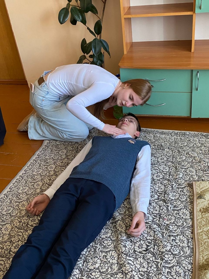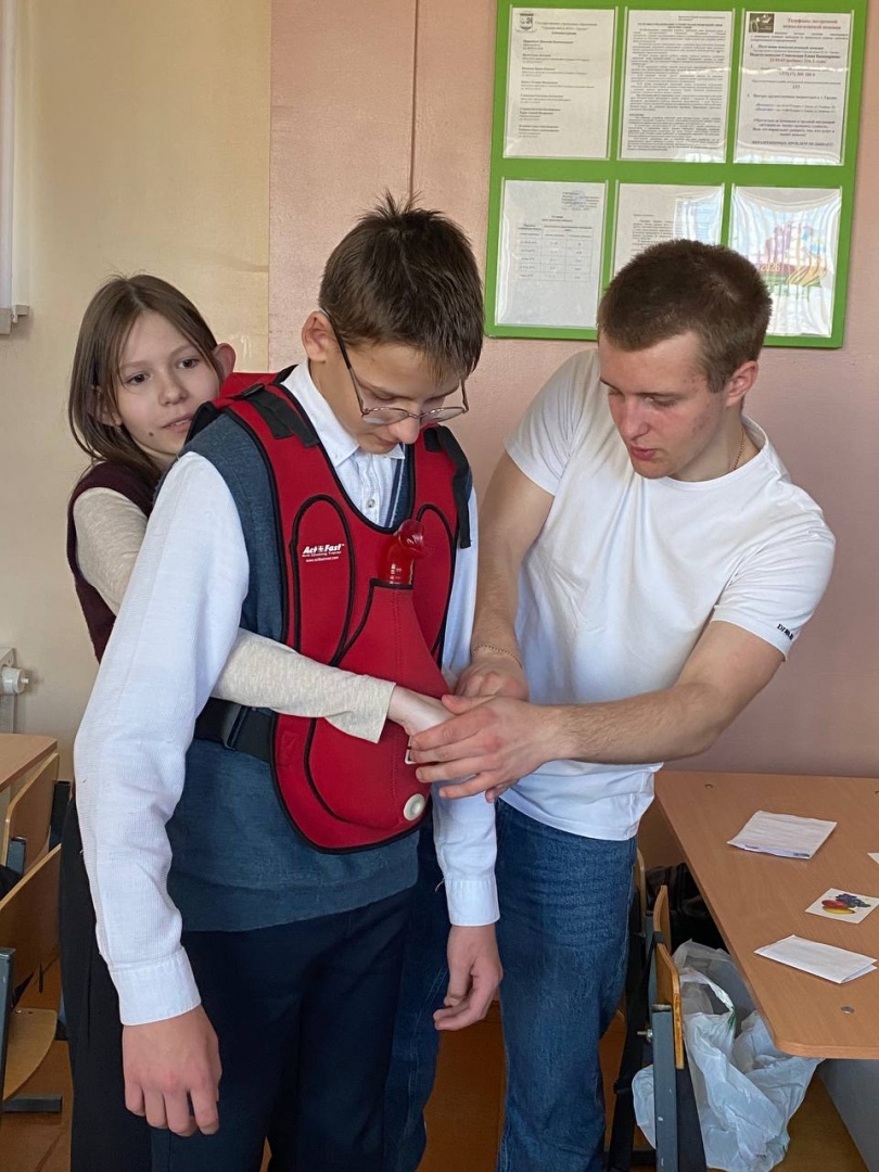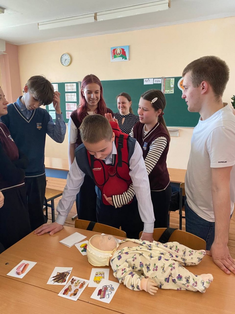 Преподаватели кафедры и студенты 2 курса педиатрического факультета Дарья Аксенова, Алексей Васюхневич, Кирилл Мурончик, Валерия Тихон и Яна Фурса обучили школьников 7 класса оказанию первой помощи при асфиксии, потери сознания, кровотечениях, ожогах.