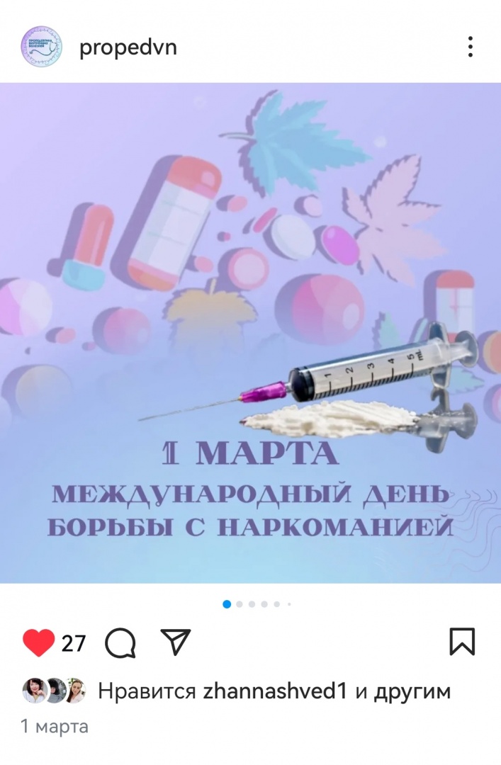 1 марта – Международный день борьбы с наркотиками. Студенткой 7 группы 3 курса ЛФ Сидиневской Анной подготовлена презентация для инстаграм-аккаунта кафедры. В учебных группах проведены информационные часы на эту тему.