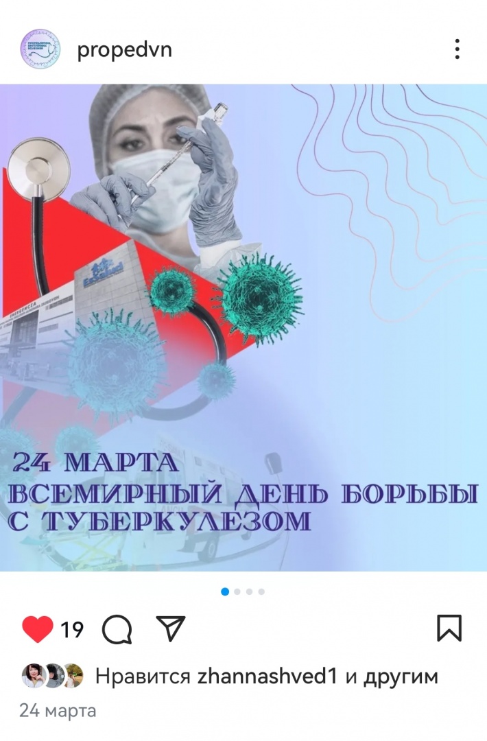 24 марта – Всемирный день борьбы с туберкулёзом. Студентка 7 группы 3 курса ЛФ Сорокина Татьяна подготовила презентацию для инстаграм-аккаунта кафедры. В учебных группах проведены информационные часы на эту тему.