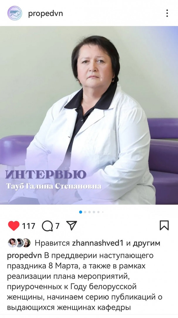 В преддверии наступающего праздника 8 Марта, а также в рамках реализации плана мероприятий, приуроченных к Году белорусской женщины, кафедра пропедевтики внутренних болезней совместно со студентами готовит серию публикаций о выдающихся женщинах кафедры. Первое интервью с ветераном кафедры пропедевтики внутренних болезней - Тауб Галиной Степановной. Её история – пример преданности профессии. Благодарим за неоценимый вклад в образование и в медицину!