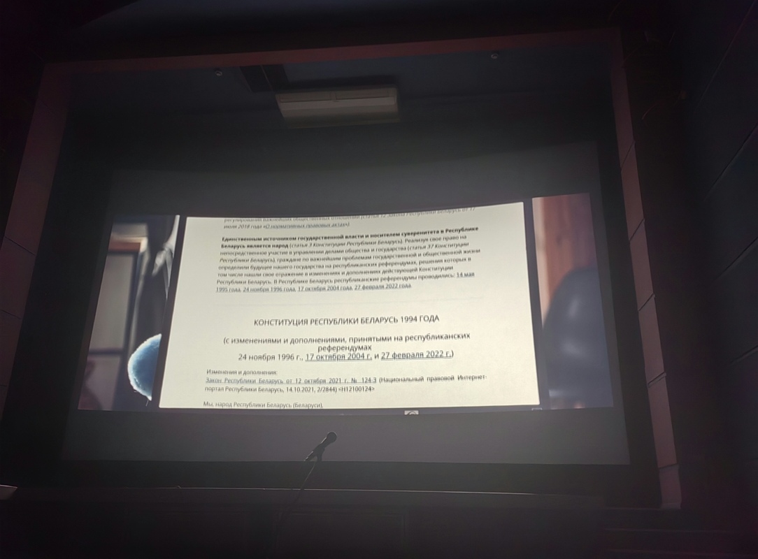 В заключение вниманию аудитории был представлен фильм «Конституция РБ». Картина рассказывает о студенте, который в попытке заработать денег проходит необычную интерактивную компьютерную игру и через неё изучает основные законы страны, права и обязанности.