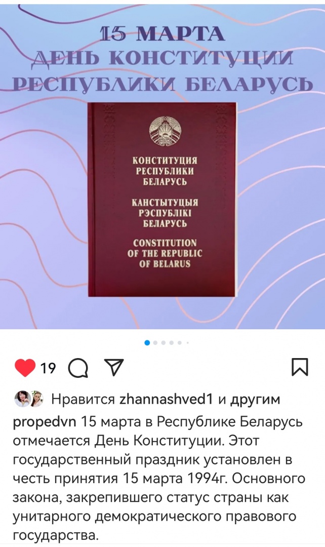 15 марта в РБ отмечается День Конституции. Студенткой 7 группы 3 курса ЛФ Балабушко Анастасией подготовлена презентация для инстаграм-аккаунта кафедры. В учебных группах проведены информационные часы на эту тему.