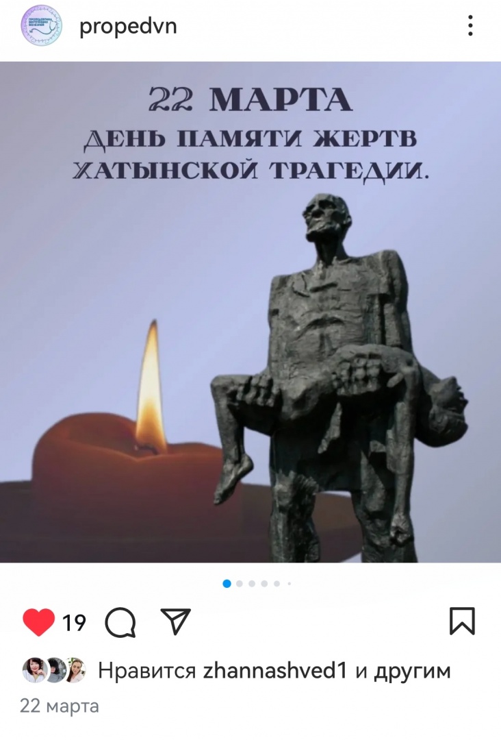 Студенткой 7 группы 3 курса ЛФ Сидиневской Анной подготовлена презентация для инстаграм-аккаунта кафедры ко Дню памяти жертв Хатыни. В учебных группах проведены информационные часы на эту тему.