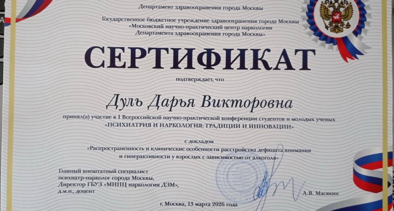 В Москве 13.03.2026 года прошла Первая Всероссийская научно-практическая конференция студентов и молодых ученых в области психиатрии и наркологии - «Психиатрия и наркология: традиции и инновации».