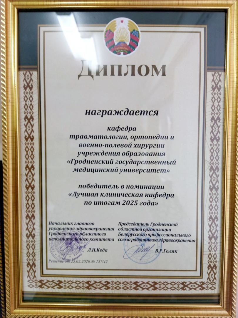 По итогам ежегодного областного смотра качества и культуры медицинского обслуживания населения по результатам деятельности в 2025 году в номинации «Лучшая клиническая кафедра по итогам 2025 года» награждена кафедра травматологии, ортопедии и военно-полевой хирурги учреждения образования «Гродненский государственный медицинский университет», расположенная на базе учреждения здравоохранения «Городская клиническая больница скорой медицинской помощи г. Гродно», заведующий кафедрой – доцент, к.м.н. БОГДАНОВИЧ Игорь Петрович.